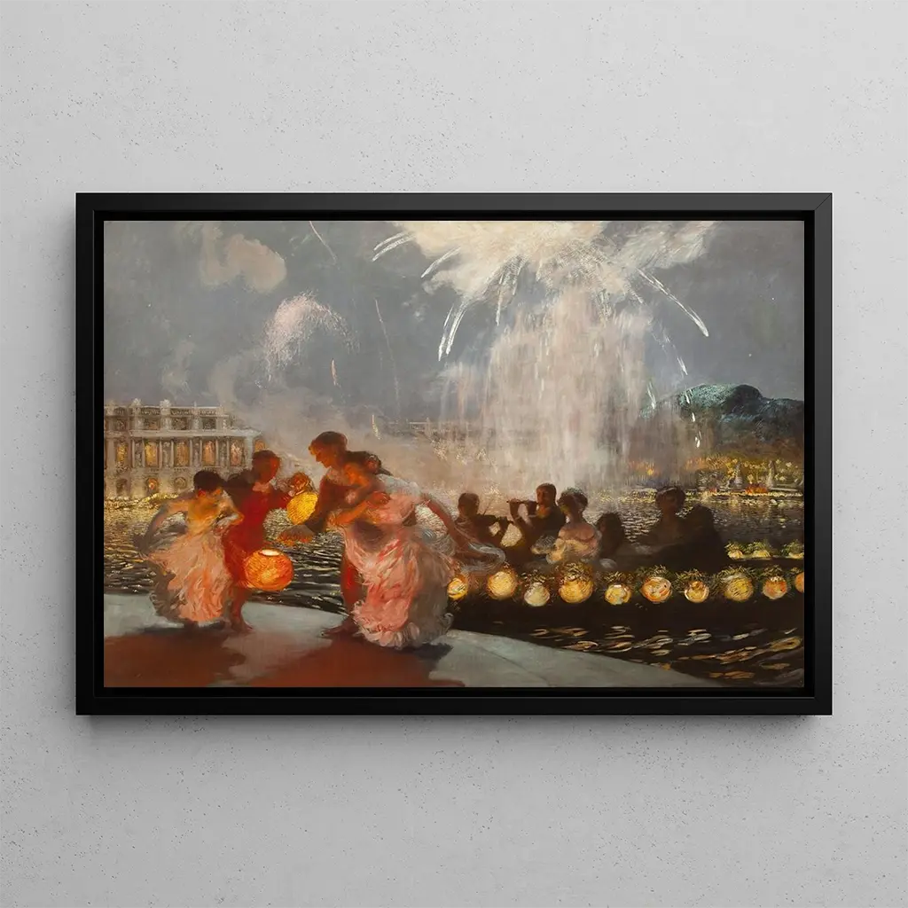 Die fröhliche Feier von Gaston La Touche ist ein lebendiges Werk, das Fröhlichkeit und Unbekümmertheit evoziert. Die Figuren, in eine festliche Atmosphäre eintauchend, scheinen im Rhythmus einer unsichtbaren Melodie zu tanzen. Die leuchtenden Farben, die von tiefroten bis zu hellgelben Tönen reichen, verschmelzen harmonisch und erzeugen ein Gefühl von Bewegung und Freude. Die impressionistische Technik von La Touche, mit ihren dynamischen Pinselstrichen, erweckt diese Szene zum Leben und ermöglicht es dem Betrachter, die Energie der Feier zu spüren. Das Werk lädt zu einer Betrachtung ein, bei der jedes Detail eine Geschichte erzählt und das Licht eine wesentliche Rolle bei der Inszenierung dieser Freude spielt.