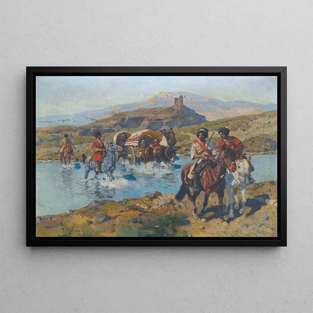 Cosaques, die einen Fluss überqueren: ein Moment des Mutes In "Cosaques, die einen Fluss überqueren" fängt Franz Roubaud einen Moment des Mutes und der Entschlossenheit ein. Dieses Gemälde zeigt eine Gruppe von Kosaken, ikonische Figuren der russischen Kultur, die mutig durch einen stürmischen Fluss ziehen. Die erdigen Farben und die dynamischen Bewegungen der Pferde und Männer schaffen eine lebendige und energiegeladene Szene. Roubaud gelingt es, die Intensität der Aktion zu vermitteln und gleichzeitig die wilde Schönheit der umliegenden Landschaft zu betonen, in der Natur und Mensch in einem epischen Tanz verschmelzen. Franz Roubaud: ein Meister des historischen Realismus Franz Roubaud, geboren 1856, ist ein russischer Künstler, der für seine historischen und militärischen Kunstdrucke bekannt ist. Ausgebildet an der Kaiserlichen Kunstakademie in Sankt Petersburg, machte er sich schnell einen Namen durch seinen realistischen Stil und seine Fähigkeit, Schlachten und Alltagsszenen mit großer Präzision darzustellen. Roubaud wurde von den Ereignissen seiner Zeit beeinflusst, insbesondere von Kriegen und Kämpfen um die nationale Identität. Seine Arbeiten, oft patriotisch geprägt, haben dazu beigetragen, die Wahrnehmung der russischen Geschichte durch die Kunst zu formen. Ein dekoratives Kunstwerk mit vielfältigen Vorzügen Der Kunstdruck von "Cosaques, die einen Fluss überqueren" ist eine faszinierende Dekorationswahl für jeden Raum. Ob im Büro, Wohnzimmer oder Ausstellungsraum, dieses Kunstwerk bringt Geschichte und Kultur in den Raum. Die Druckqualität garantiert eine detailgetreue Wiedergabe der Farben und Details und bietet somit einen ästhetisch ansprechenden Blickfang. Durch die Integration dieses Kunstdrucks in Ihre Dekoration schaffen Sie einen Blickpunkt, der Interesse und Gesprächsstoff weckt, und würdigen gleichzeitig das künstlerische und historische Erbe Russlands.