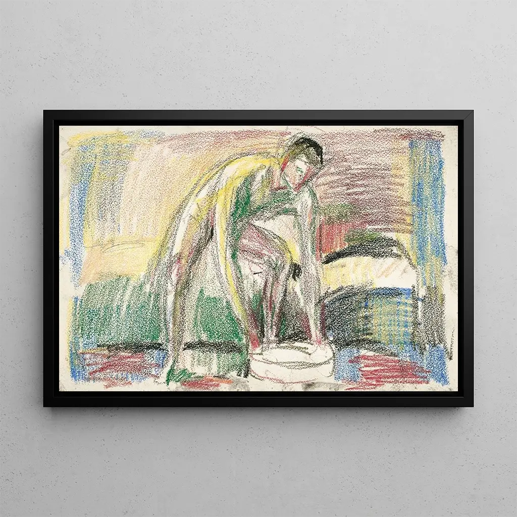 Homme nackt waschend seine Füße: eine Erforschung der menschlichen Verletzlichkeit In "Homme nackt waschend seine Füße" taucht Edvard Munch in eine intime und bewegende Szene ein, in der die menschliche Verletzlichkeit hervorgehoben wird. Die Komposition, die sich auf die männliche Figur konzentriert, wird durch dunkle Farben und auffällige Kontraste verstärkt, die eine sowohl verstörende als auch fesselnde Atmosphäre schaffen. Die Technik von Munch, geprägt von expressiven Pinselstrichen, erweckt die rohe Emotion zum Leben, die von diesem Werk ausgeht, und lädt den Betrachter ein, über die menschliche Bedingung und Einsamkeit nachzudenken. Edvard Munch: der Vorläufer des Expressionismus Edvard Munch, norwegischer Künstler, emblematisch für das späte 19. und frühe 20. Jahrhundert, gilt oft als Vorläufer des Expressionismus. Sein Werk ist tief beeinflusst von seinen persönlichen Erfahrungen und inneren Kämpfen, was sich in seinen wiederkehrenden Themen Tod, Liebe und Melancholie widerspiegelt. "Homme nackt waschend seine Füße" ist Teil dieser Erforschung der menschlichen Psyche und zeugt von Munchs Bedeutung in der Entwicklung der modernen Kunst und seinem Einfluss auf zukünftige Künstlergenerationen. Eine dekorative Anschaffung mit vielfältigen Vorzügen Der kunstdruck von "Homme nackt waschend seine Füße" stellt ein zentrales Element für jede Innendekoration dar. Ob in einem zeitgenössischen Wohnzimmer oder einem künstlerischen Büro, diese Leinwand bringt emotionale Tiefe und Reflexion über die menschliche Natur. Die Druckqualität sorgt für eine beeindruckende Treue zu den Nuancen und Details des Originalwerks, während sie Ihrem Raum eine elegante Note verleiht. Mit der Wahl dieses kunstdrucks entscheiden Sie sich für ein Kunstwerk, das nicht nur Ihre Umgebung verschönert, sondern auch tiefgründige Gespräche und Reflexionen anregt.