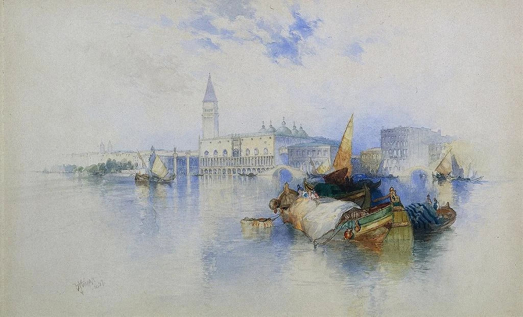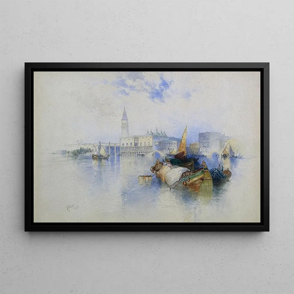 Das Gemälde "Bassin de San Marco" von Thomas Moran vermittelt eine bezaubernde Atmosphäre, in der das Licht auf den ruhigen Wassern der venezianischen Lagune tanzt. Die Nuancen von Blau und Grün verschmelzen harmonisch und erzeugen ein Gefühl von Gelassenheit und Traum. Die Aquarelltechnik, die Moran meisterhaft beherrscht, ermöglicht es, die Transparenz des Wassers und den Spiegel der historischen Gebäude am Ufer des Beckens einzufangen. Dieses Gemälde lädt den Betrachter ein, in einen Moment der Kontemplation einzutauchen, die Sanftheit der Luft zu spüren und die zeitlose Schönheit Venedigs zu bewundern.