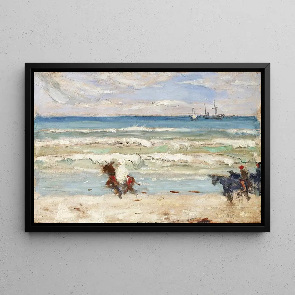 In "Szenen am Strand in Tanger" fängt James Wilson Morrice die lebendige Essenz eines sonnigen Tages an der marokkanischen Küste ein. Die warmen und leuchtenden Farben, die von goldgelb bis zu den tiefblauen Meeres reichen, vermitteln eine sommerliche und fröhliche Atmosphäre. Die dynamische Komposition, mit Figuren, die sich im Sand aalen, und Segeln im Hintergrund, lädt zum Träumen ein. Morrice spielt geschickt mit Licht und Schatten, was ein Gefühl von Bewegung und Lebendigkeit erzeugt. Dieses Werk ist eine wahre Einladung, die einfachen Freuden des Lebens am Meer zu entdecken.