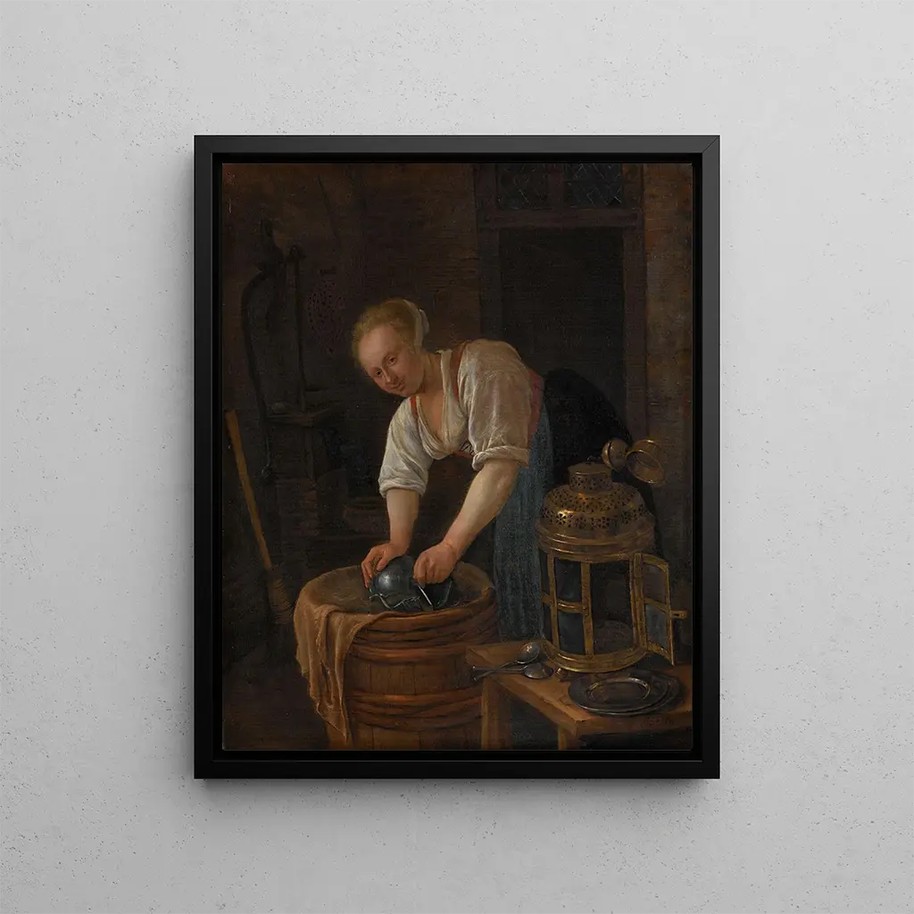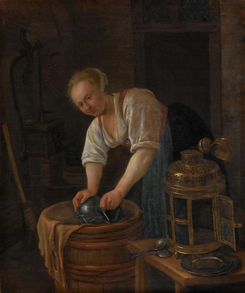 Frau, die Metallgegenstände reinigt - Jan Steen