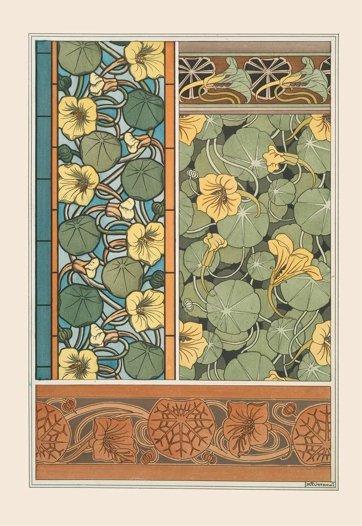 Maurice Pillard Verneuil, aktiv zu Beginn des 20. Jahrhunderts, ist bekannt für seine Rolle in der Bewegung des Jugendstils. Seine Arbeit zeichnet sich durch einen innovativen Ansatz bei floralen Mustern aus, der dekorative Elemente integriert, die die einfache Darstellung übersteigen. Beeinflusst von den künstlerischen Strömungen seiner Zeit, konnte Verneuil Tradition und Moderne verbinden und Werke schaffen, die die Schönheit der Natur feiern und gleichzeitig in eine zeitgenössische Ästhetik eingebunden sind. Sein Erbe besteht weiter und inspiriert viele Künstler, die floralen Themen mit erneuerter Sensibilität zu erforschen.