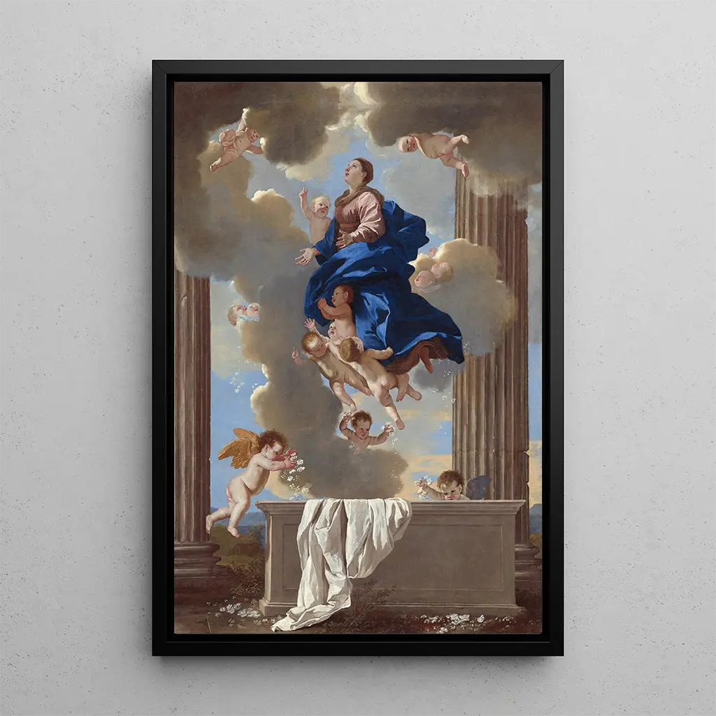 Nicolas Poussin, geboren 1594, gilt als einer der größten Maler des französischen Klassizismus. Sein Werk zeichnet sich durch formale Strenge und intellektuelle Tiefe aus, beeinflusst von den großen Meistern der Renaissance. Poussin verstand es, narrative und symbolische Elemente in seine Kompositionen zu integrieren, was ihn zu einem Pionier in der Kunst des Geschichtenerzählens durch Malerei machte. L'Assomption de la Vierge ist ein perfektes Beispiel für sein Talent, das Tradition und Innovation vereint und seinen nachhaltigen Einfluss auf die westliche Kunst bezeugt.