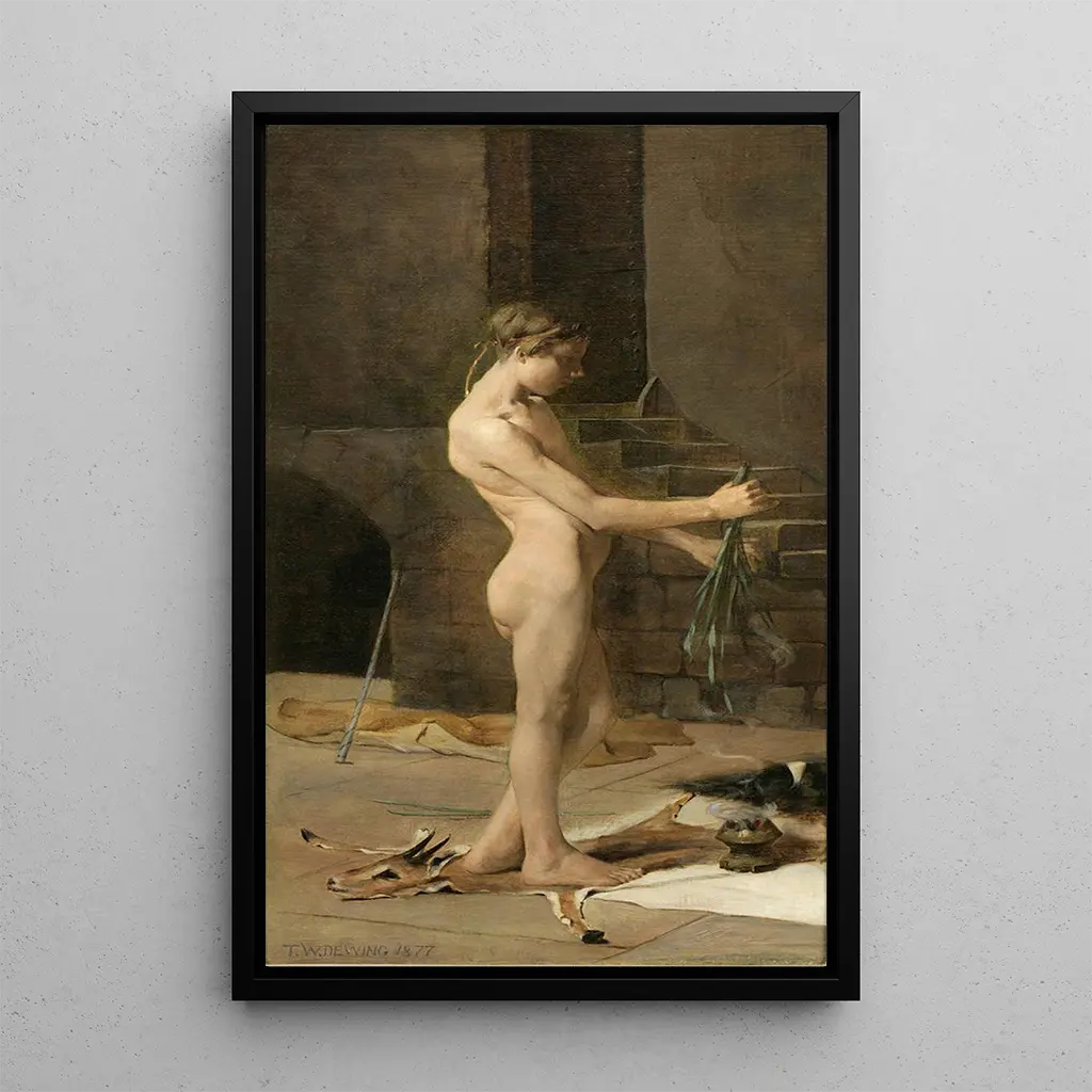 Thomas Wilmer Dewing, aktiv gegen Ende des 19. und Anfang des 20. Jahrhunderts, gilt als einer der bedeutendsten Vertreter des amerikanischen Symbolismus. Beeinflusst von den Präraffaeliten und der impressionistischen Malerei, entwickelte Dewing einen einzigartigen Stil, der die Schönheit der Formen mit einer träumerischen Atmosphäre verbindet. Sein Werk zeichnet sich durch eine besondere Aufmerksamkeit für Licht und Farbe sowie für die Darstellung idealisierter weiblicher Figuren aus. L'Esclave du sorcier, geschaffen in einer Zeit, in der die amerikanische Kunst versuchte, sich auf der internationalen Bühne zu behaupten, zeugt von Dewings Bedeutung in der Entwicklung der Kunst in den Vereinigten Staaten.