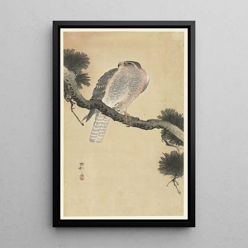 Das Gemälde "Faucon sur branche de pin" von Ohara Koson vermittelt eine Szene voller Ruhe und Kraft. Die Komposition hebt einen majestätischen Falken hervor, der zart auf einem Kiefernzweig sitzt, umgeben von einer minimalistischen Landschaft. Die sanften und natürlichen Farben, die von beruhigenden Grüntönen bis zu warmen Brauntönen reichen, schaffen eine friedliche Atmosphäre. Die Technik des japanischen Holzschnitts ermöglicht es, die feinen Details des Gefieders des Vogels und die Textur der Rinde einzufangen. Dieses Werk lädt zur Kontemplation ein und bietet einen Moment der Ruhe im Trubel des Alltags.