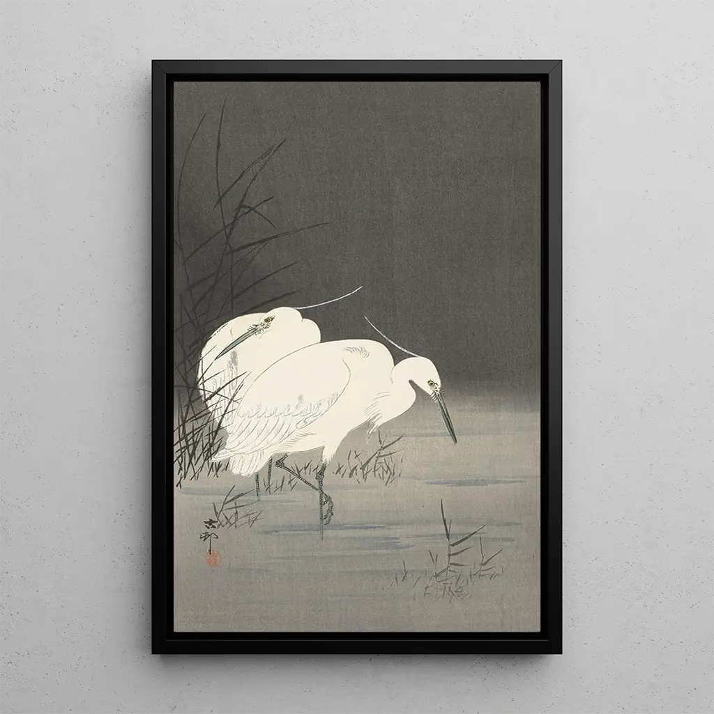 Der kunstdruck "Zwei Reiher im Schilf" von Ohara Koson zeigt eine friedliche Szene, in der die Natur in ihrer ganzen Pracht zum Ausdruck kommt. Die Reiher, majestätisch und anmutig, stehen zwischen den Schilfrohren und schaffen ein lebendiges Bild, das zur Betrachtung einlädt. Die sanften Farbtöne von Grün und Beige, verbunden mit der Zartheit der Vögel, vermitteln eine Atmosphäre von Ruhe und natürlicher Schönheit. Die Drucktechnik, meisterhaft beherrscht von Koson, ermöglicht es, jedes Detail fein wiederzugeben und ein reichhaltiges, beruhigendes visuelles Erlebnis zu bieten, das den Betrachter in eine Welt der Gelassenheit entführt.