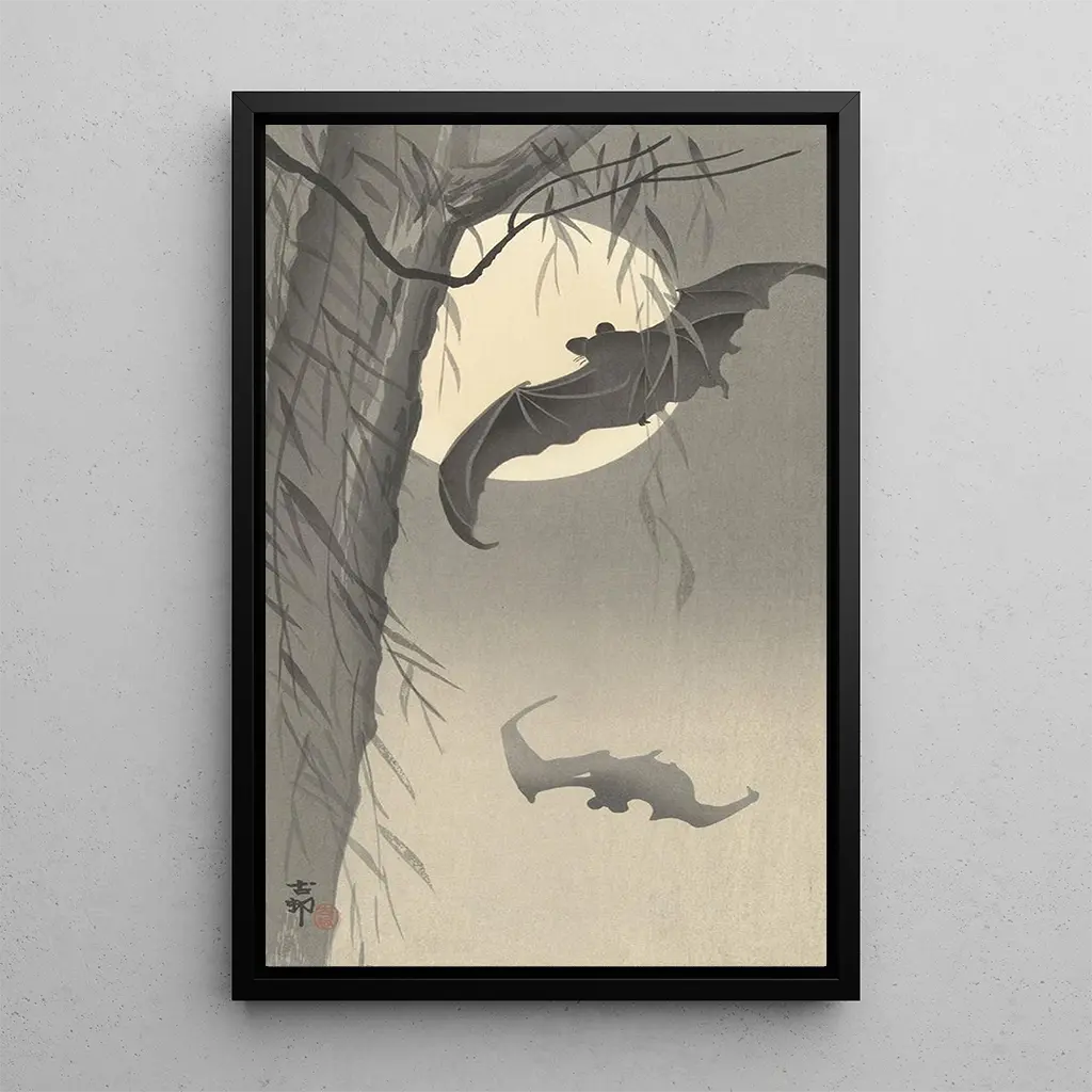 In dieser fesselnden kunstdruck-Interpretation, "Zwei Fledermäuse bei Vollmond", taucht Ohara Koson uns in eine nächtliche Atmosphäre voller Geheimnis ein. Das Leinwandbild, geprägt von dunklen Tönen und silbernen Nuancen, erinnert an das sanfte Licht des Mondes, das den anmutigen Flug der Fledermäuse erleuchtet. Die zarten Details der Flügel und die Silhouetten der Tiere schaffen einen beeindruckenden Kontrast zum Hintergrund, während die harmonische Komposition zur Betrachtung einlädt. Das Werk strahlt eine verstörende Ruhe aus, in der Natur und Tierwelt in einem stillen Tanz unter dem Sternenhimmel verschmelzen.