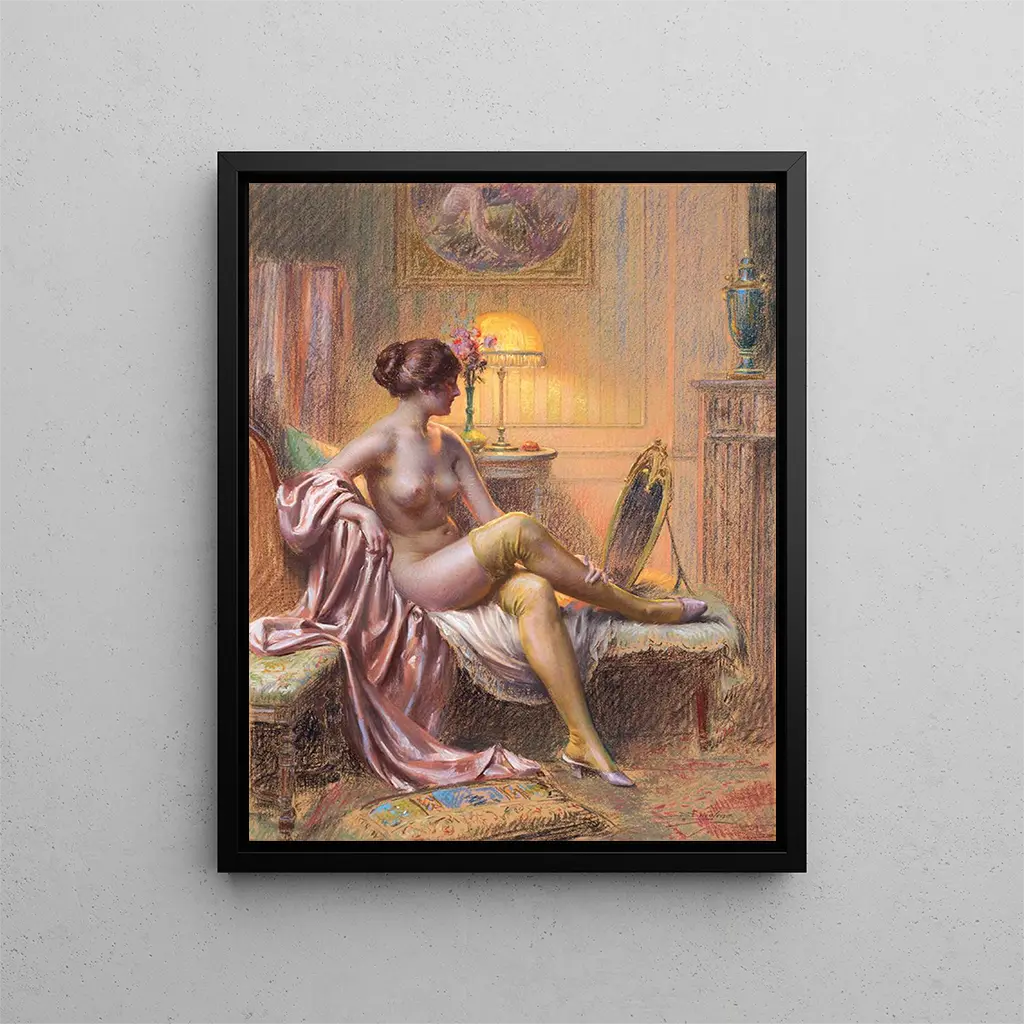 La Toilette par lampe - Delphin Enjolras ist ein Werk, das durch seine Zartheit und seine intime Atmosphäre besticht. In dieser Szene, in der das gedämpfte Licht einer Lampe die weiblichen Formen streichelt, gelingt es dem Künstler, einen Moment des Lebens einzufangen, einen Augenblick, der zwischen Intimität und Kontemplation schwebt. Die Komposition, zugleich einfach und emotional reich, lädt den Betrachter ein, in das persönliche Universum der dargestellten Frau einzutauchen. Dieses Gemälde, eine wahre Ode an die weibliche Schönheit, ruft Gefühle von Sanftheit und Gelassenheit hervor und zeigt gleichzeitig die technische Meisterschaft von Enjolras. Durch dieses Werk bietet der Künstler uns nicht nur eine Vision der Frau, sondern auch einen Einblick in die Lebensart am Ende des 19. Jahrhunderts, wo Eleganz auf Einfachheit trifft.