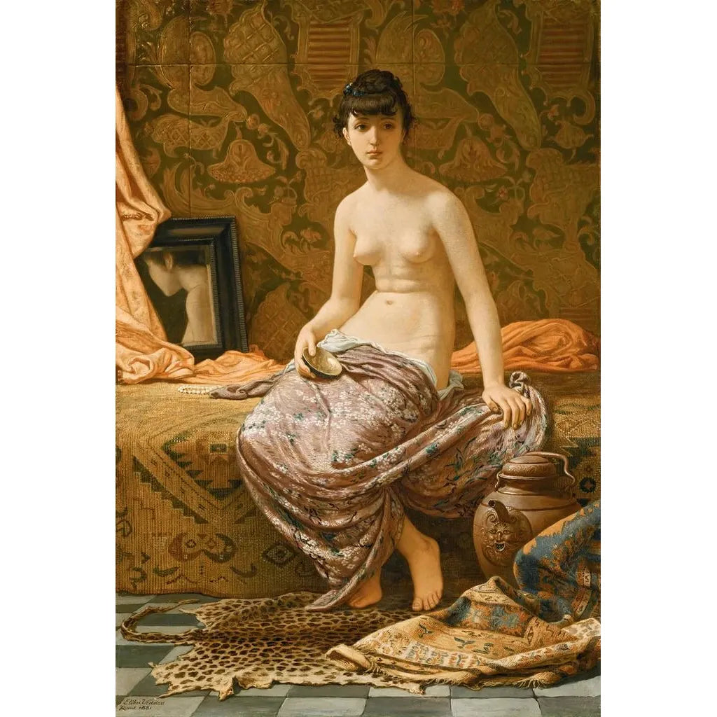 Odalisque : eine Flucht in die Exotik Die Odalisque von Elihu Vedder ist ein Werk, das eine Welt voller Sinnlichkeit und Geheimnis evoziert. Mit seinen warmen Farbtönen und orientalischen Mustern entführt dieses Gemälde den Betrachter in eine Traumwelt voller Genuss und Leidenschaft. Die zarte Komposition hebt die anmutige Silhouette der weiblichen Figur hervor, umgeben von einer detailreichen Kulisse, die den Blick fesselt. Vedder’s Technik, die sowohl präzise als auch ausdrucksstark ist, schafft eine Atmosphäre der Ruhe und Kontemplation. Jedes Element des Kunstwerks scheint eine Geschichte zu erzählen, die eines Moments zwischen Realität und Fantasie. Elihu Vedder : ein Meister des Traums und der Fantasie Elihu Vedder, ein bedeutender Künstler des 19. Jahrhunderts, hat die Essenz der Exotik durch seine Werke eingefangen. Beeinflusst von den Reisen und Kulturen, denen er begegnete, entwickelte Vedder einen einzigartigen Stil, der Symbolismus und Romantik verbindet. Die Odalisque, geschaffen in einer Zeit, in der den Orient den Westen faszinierte, zeugt von seinem Interesse an orientalischen Themen und Darstellungen der Weiblichkeit. Seine Karriere, geprägt von einer unermüdlichen Suche nach Schönheit und Wahrheit, machte ihn zu einer unverzichtbaren Figur der amerikanischen Kunst. Vedder verstand es, Technik und Emotion zu vereinen und Werke zu schaffen, die weiterhin Kunstliebhaber begeistern. Eine dekorative Anschaffung mit vielfältigen Vorzügen Der kunstdruck der Odalisque ist eine ideale Wahl für alle, die ihrem Interieur einen Hauch von Exotik verleihen möchten. Ob im Wohnzimmer, Schlafzimmer oder Büro – dieses Gemälde überzeugt durch seine Qualität, die den Nuancen und Details des Originalwerks treu bleibt. Seine ästhetische Anziehungskraft macht es zu einem echten dekorativen Highlight, das einen Raum in einen Ort der Träume und Flucht verwandeln kann. Mit der Wahl dieses Kunstwerks verschönern Sie nicht nur Ihre Umgebung, sondern laden auch ein Stück künstlerische Geschichte in Ihren Alltag ein.
