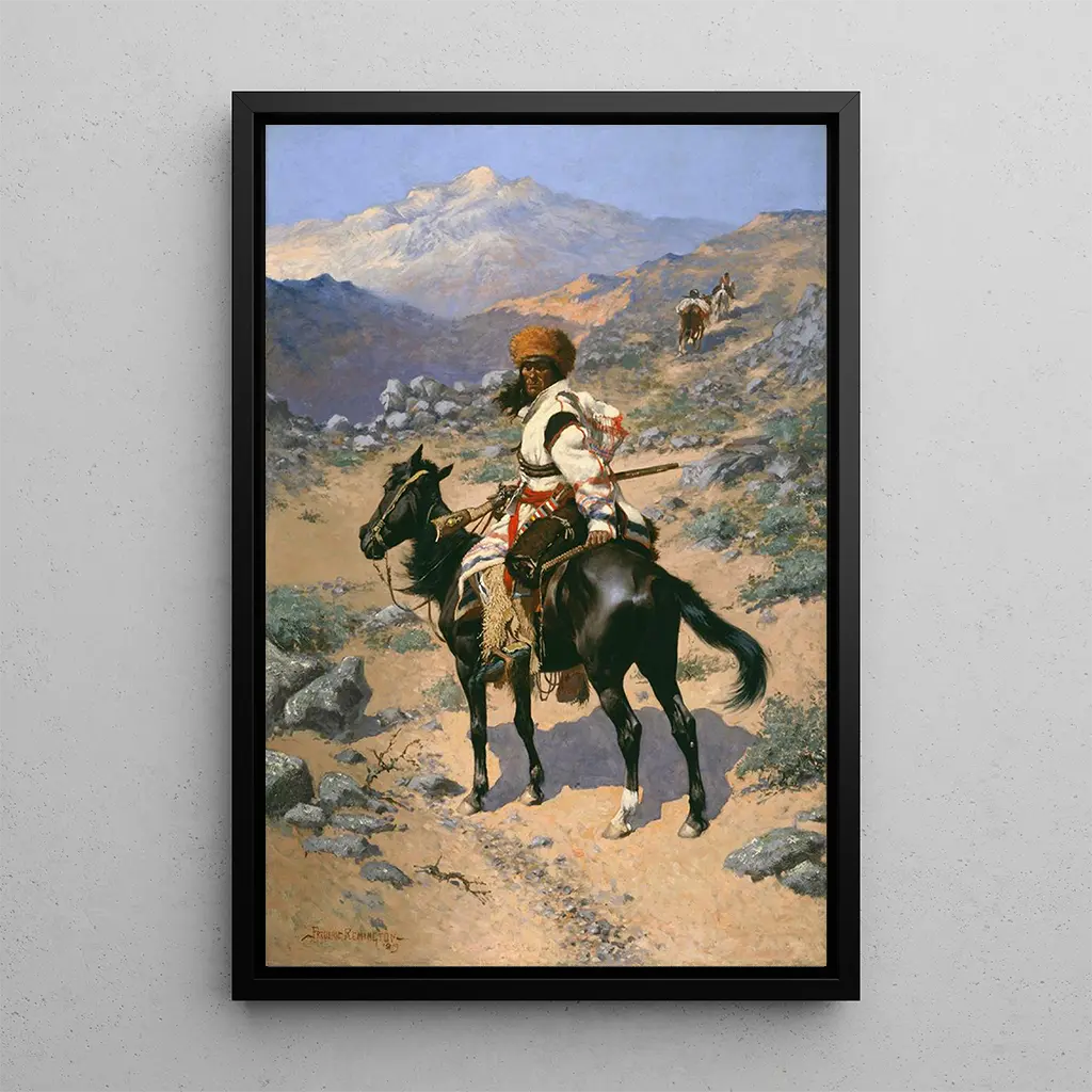 In "Ein indianischer Fallensteller" fängt Frederic Remington die Essenz des wilden Amerikas durch eine dynamische und ausdrucksstarke Komposition ein. Das Gemälde zeigt einen Fallensteller, stolz und widerstandsfähig, inmitten der Natur, umgeben von majestätischen Landschaften. Die erdigen Farben und die Grüntöne spiegeln die Fülle an Tier- und Pflanzenwelt wider, während die Ölmaltechnik der Arbeit eine lebendige Textur verleiht. Die Atmosphäre, die von diesem Werk ausgeht, ist sowohl heroisch als auch kontemplativ und lädt den Betrachter ein, in eine Welt einzutauchen, in der Mensch und Natur in Harmonie koexistieren.