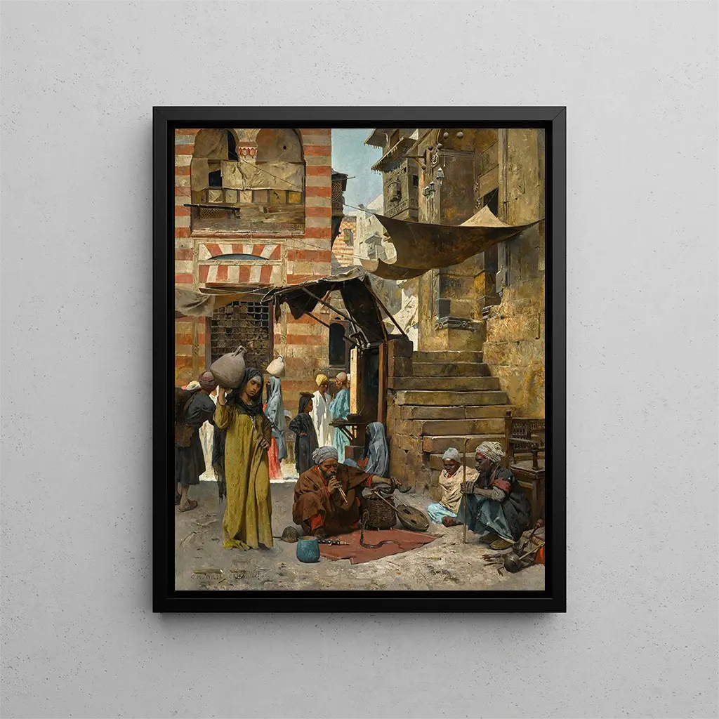 Reproduktion Ein Souk in Kairo - Charles Wilda – Faszinierende Einführung In der reichen und komplexen Welt des orientalistischen Kunsts taucht das Werk "Ein Souk in Kairo" von Charles Wilda als lebendiges Zeugnis des täglichen Lebens im Herzen der arabischen Welt auf. Dieses Gemälde, das einen lebhaften Souk darstellt, versetzt uns an einen Ort, an dem Farben, Klänge und Düfte sich vermischen, um eine einzigartige Atmosphäre zu schaffen. Durch Wildas Blick wird der Betrachter eingeladen, enge Gassen und geschäftige Stände voller Waren zu erkunden und so die Schönheit und Vielfalt der ägyptischen Kultur zu entdecken. Das Werk beschränkt sich nicht nur auf die Darstellung eines einfachen Marktes; es evoziert ein sensorisches Erlebnis, bei dem jedes Detail eine Geschichte erzählt und jedes Gesicht eine Emotion widerspiegelt. Stil und Einzigartigkeit des Werks Der Stil von Charles Wilda zeichnet sich durch seine akribische Liebe zum Detail und seine Fähigkeit aus, die Essenz seiner Motive einzufangen. In "Ein Souk in Kairo" verwendet er eine Palette warmer, erdiger Farben, die das Sonnenlicht widerspiegeln, das die Wände alter Gebäude beleuchtet. Die Figuren, gekleidet in traditionelle Kleidung, sind so präzise dargestellt, dass sie fast zum Leben erwachen. Schatten und Licht spielen eine entscheidende Rolle in der Komposition und verleihen der Szene Tiefe und Dimension. Wilda gelingt es, eine lebendige Atmosphäre zu schaffen, in der man fast die Rufe der Händler und das Klirren der Münzen hören kann. Dieses Werk beschränkt sich nicht auf eine bloße visuelle Darstellung; es ist ein offenes Fenster zu einer reichen Kultur voller Nuancen und Traditionen. Der Künstler und sein Einfluss Charles Wilda, ein österreichischer Künstler, konnte sich im orientalistischen Bewegung des 19. Jahrhunderts durchsetzen, einem künstlerischen Strom, der viele europäische Maler faszinierte. Sein Werk ist geprägt von tiefem Respekt für die Kulturen, die er darstellt, sowie vom Wunsch, sie durch seine Kunst zu verewigen. Wilda reiste um die Welt, doch in Ägypten fand er eine unerschöpfliche Inspirationsquelle. Seine Gemälde, oft von einer gewissen Melancholie durchdrungen, zeugen von einer Epoche, in der der Orient als geheimnisvoller und bezaubernder Ort wahrgenommen wurde. Der Einfluss von Wilda ist