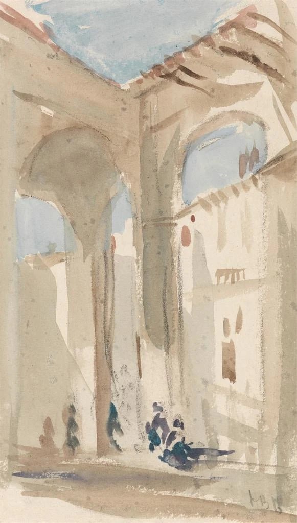 Das Gemälde "Figuren in einer orientalischen Kolonnade" von Hercules Brabazon Brabazon entführt den Betrachter in eine Welt voller Exotik und Geheimnis. Die menschlichen Figuren, gekleidet in bunte Kostüme, bewegen sich anmutig unter den Bögen der Kolonnade. Das durch die Säulen gefilterte Licht erzeugt Schattenspiele, die der Szene Tiefe verleihen. Die lebendigen Farben und die detaillierte Ausführung zeugen vom Talent Brabazons, das Leben und die Energie eines Moments einzufangen. Dieses Werk lädt zur Betrachtung ein und evoziert eine Atmosphäre, die zugleich warmherzig und faszinierend ist.