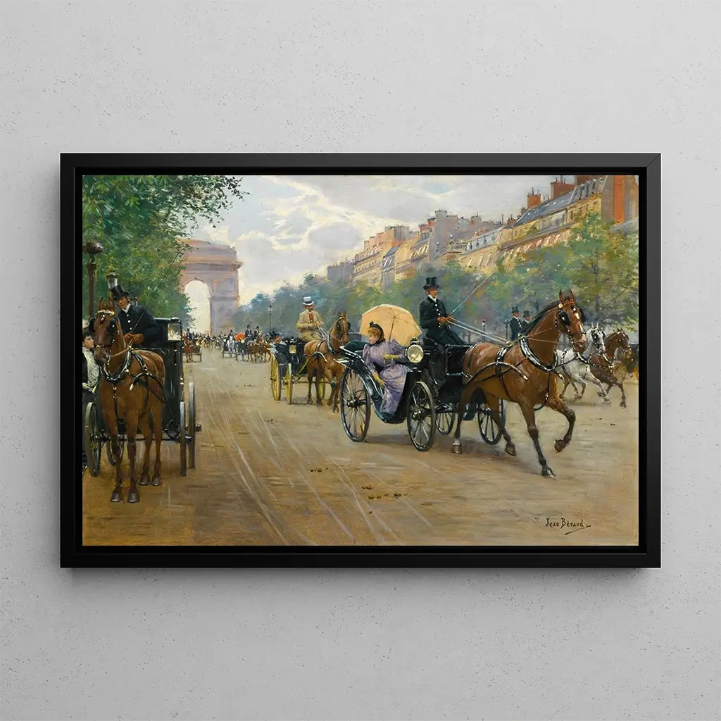 Jean Béraud, geboren 1849, ist ein französischer Maler, bekannt für seine Szenen des Alltagslebens in Paris. Hauptsächlich während der Belle Époque tätig, konnte er das Wesen dieser Zeit durch seine Werke einfangen. Beeinflusst von der impressionistischen Bewegung, entwickelte Béraud einen einzigartigen Stil, der Realismus und impressionistische Akzente verbindet. Seine Bilder, oft mit städtischen Szenen im Mittelpunkt, zeugen von der sozialen und kulturellen Entwicklung der französischen Hauptstadt. „Szenen auf den Champs-Élysées“ zeigt perfekt sein Talent, Momentaufnahmen des Lebens zu verewigen, und bietet gleichzeitig eine subtile Kritik an der Gesellschaft seiner Zeit.