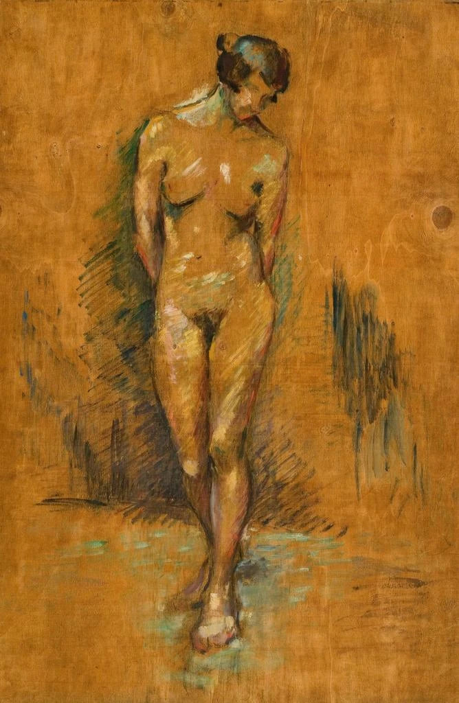 In "Nu weiblich stehend" bietet Ludvig Karsten eine beeindruckende Darstellung der weiblichen Form. Die harmonische Komposition und die zarten Kurven des Modells werden durch ein subtilen Spiel von Licht und Schatten hervorgehoben. Die sanften und natürlichen Farben wecken eine sinnliche Atmosphäre, die sowohl raffiniert als auch kraftvoll ist, und schaffen eine Stimmung der Gelassenheit und Kontemplation. Die Haltung des Aktes, zugleich elegant und dynamisch, lädt dazu ein, die körperliche Schönheit zu schätzen, während sie gleichzeitig eine gewisse Verletzlichkeit andeutet, was das Werk zutiefst menschlich und zugänglich macht.