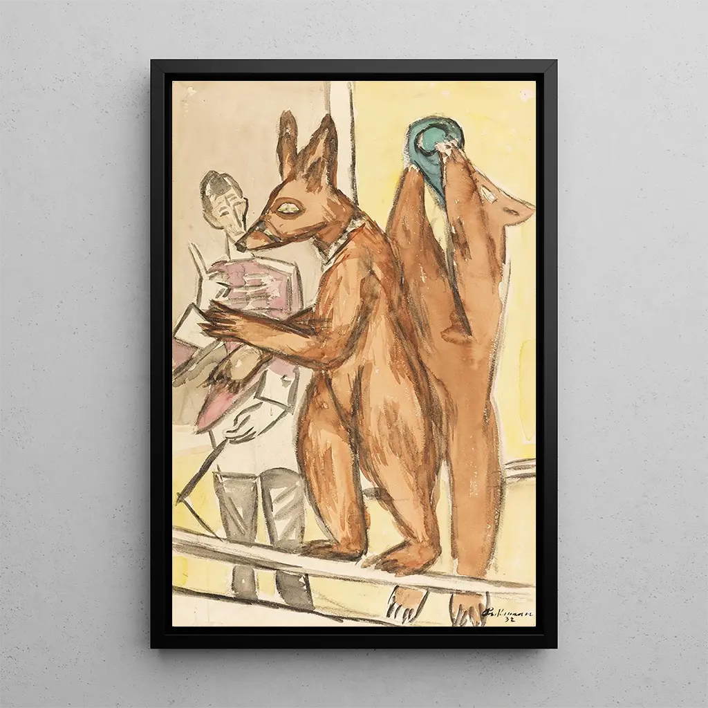 Geboren 1884 in Leipzig, ist Max Beckmann eine der bedeutendsten Figuren des deutschen Expressionismus. Seine Karriere erstreckt sich über mehrere Jahrzehnte, geprägt von historischen Umbrüchen wie dem Ersten Weltkrieg und dem Aufstieg des Nationalsozialismus. Beeinflusst von Künstlern wie Vincent van Gogh und Edvard Munch, entwickelt Beckmann einen einzigartigen Stil, der durch intensive Farben und dynamische Kompositionen gekennzeichnet ist. Seine Werke, oft autobiografisch, erforschen Themen von Leiden, Entfremdung und der Suche nach Identität. "Ours dressés" reiht sich in diese Linie ein und spiegelt die Ängste einer turbulenten Epoche wider.