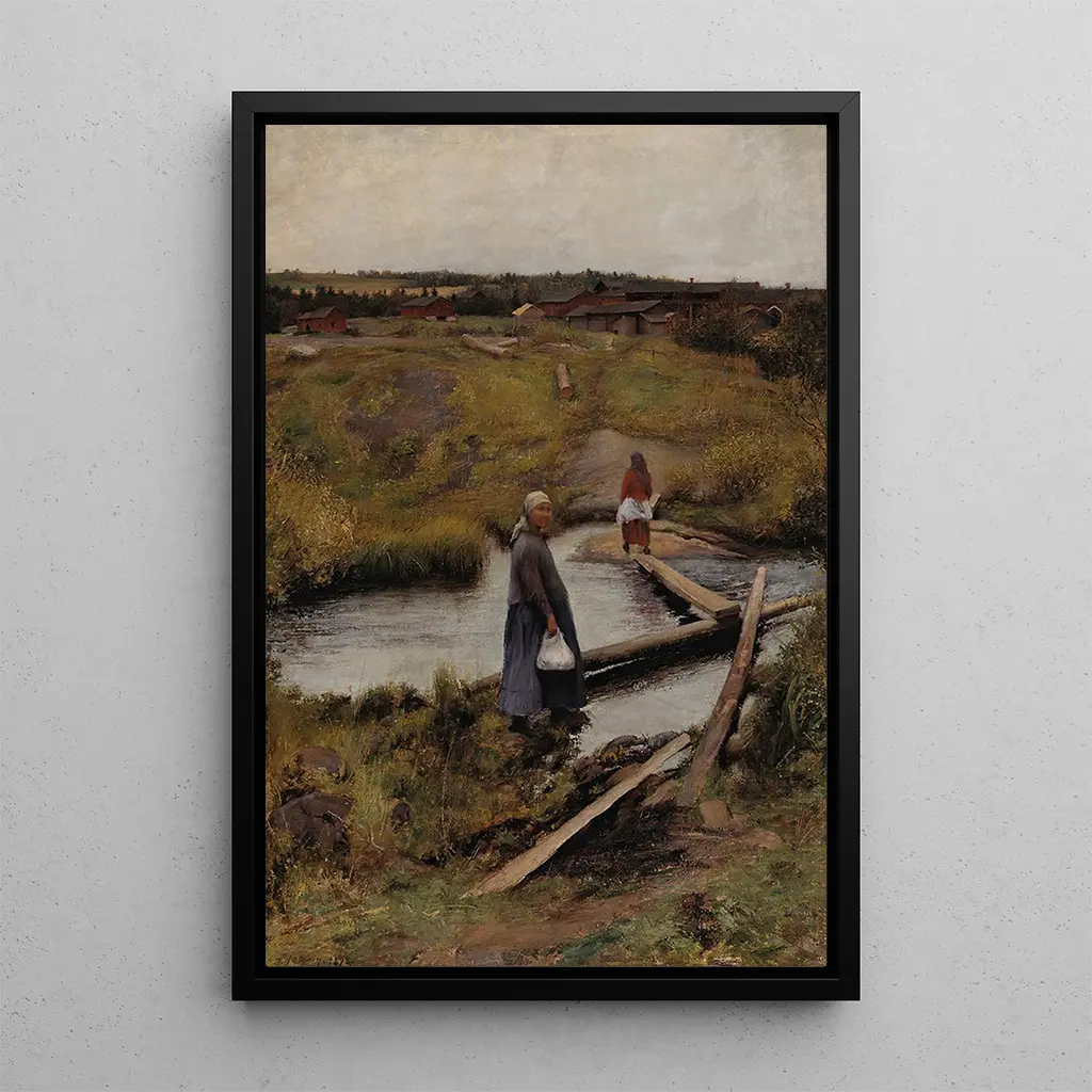In "Der Abkürzung" taucht Pekka Halonen in eine intime Szene ein, in der Natur und Menschlichkeit aufeinandertreffen. Das Gemälde zeigt einen gewundenen Weg, gesäumt von Bäumen, der den Betrachter einlädt, sich auf eine Reise durch eine grüne Landschaft zu begeben. Die erdigen Farben und die Grüntöne schaffen eine warme Atmosphäre, während das sanfte Licht durch das Laub filtert und dem Werk eine fast mystische Dimension verleiht. Halonen gelingt es, einen Moment der Ruhe einzufangen, in dem die Zeit stillzustehen scheint, und bietet eine Reflexion über den Lebensweg.