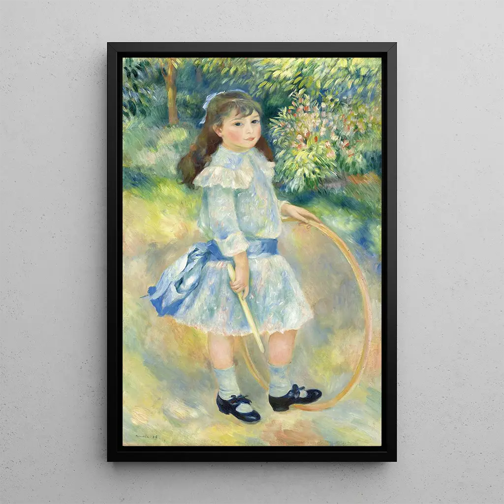 In diesem lebendigen Werk fängt Pierre-Auguste Renoir die Unbekümmertheit der Kindheit durch die Figur eines jungen Mädchens ein, das mit einem Reif spielt. Die leuchtenden Farben, von sanften Rosatönen bis zu hellen Grüntönen, schaffen eine fröhliche und leichte Atmosphäre. Renoirs impressionistische Technik zeigt sich in fließenden Pinselstrichen und Lichtspielen, die der Szene Leben einhauchen. Die Komposition, auf das Kind fokussiert, vermittelt ein Gefühl von Bewegung und Freiheit und lädt den Betrachter ein, diesen Moment einfachen Glücks zu teilen.