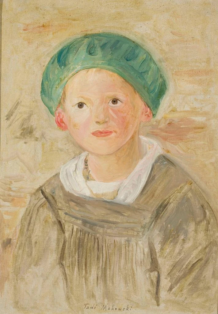 In diesem Werk fängt Tadeusz Makowski einen flüchtigen Moment der Kindheit durch den Blick eines jungen Jungen mit grünem Cap ein. Die Komposition wird von lebendigen und warmen Farben dominiert, die Unschuld und Lebensfreude hervorrufen. Die Gesichtszüge, zart skizziert, vermitteln eine spürbare Emotion, während der verschwommene Hintergrund das Hauptmotiv in den Vordergrund stellt. Die Technik von Makowski, die Ölmalerei mit impressionistischen Einflüssen verbindet, schafft eine sanfte und träumerische Atmosphäre, die den Betrachter einlädt, in diesen Moment der Reinheit und Einfachheit einzutauchen.