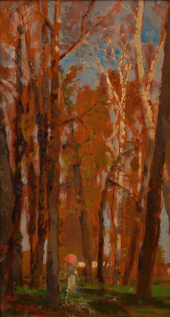 „Arbres du Prater“ von Tina Blau ist ein faszinierendes Werk, das die Magie eines sonnigen Nachmittags im berühmten Wiener Park einfängt. Die majestätischen Bäume, mit bemerkenswerter Feinfühligkeit gemalt, scheinen sanft im leichten Wind zu wiegen. Die Lichtspiele, erzeugt durch die durch das Laub filternde Sonne, verleihen der Szene eine fast ätherische Dimension. Die Technik der Künstlerin, gekennzeichnet durch dynamische Pinselstriche und eine reiche Palette an Grün- und Brauntönen, verleiht diesem Gemälde eine lebendige und einladende Atmosphäre, die zum Flanieren und Träumen einlädt.