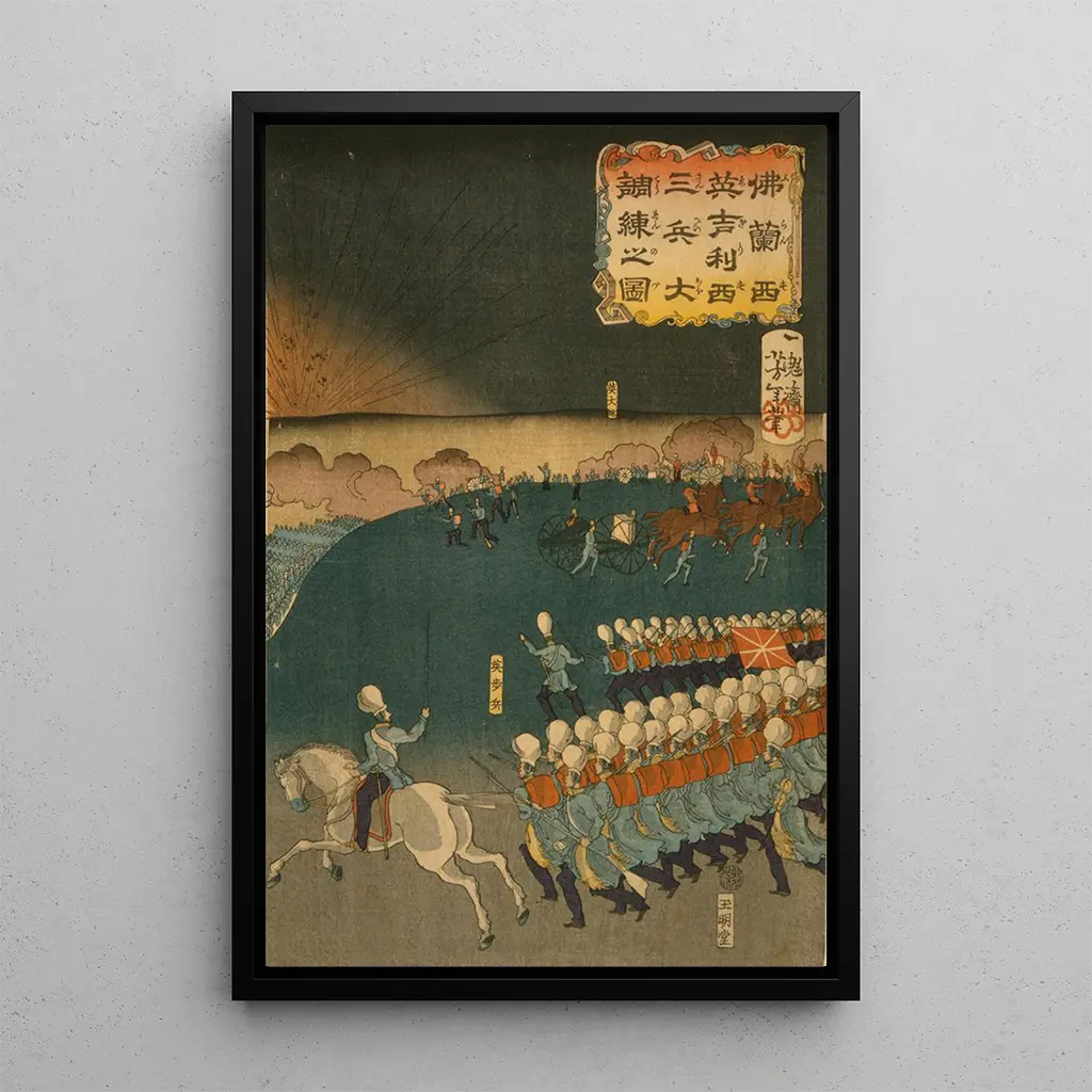 Furansu Igirisu sanpei daichsen no zu : eine Hommage an die Begegnung der Kulturen Die reproduktion von "Furansu Igirisu sanpei daichsen no zu" von Tsukioka Yoshitoshi ist ein faszinierendes Kunstwerk, das die Begegnung zwischen Japan und dem Westen illustriert. Die leuchtenden Farben und die zarten Muster dieses Kunstdrucks zeugen von einer Epoche, in der kulturelle Austausche florierten. Die Ukiyo-e-Technik, mit ihren präzisen Linien und feinen Details, schafft eine Atmosphäre, die zugleich dynamisch und harmonisch ist. Jede Figur, jedes Dekorelement ist sorgfältig gestaltet, um eine Geschichte von Entdeckung und Interaktion zu erzählen und den Betrachter einzuladen, die Nuancen dieser historischen Begegnung zu erkunden. Tsukioka Yoshitoshi : ein Pionier des modernen Kunstdrucks Tsukioka Yoshitoshi, eine ikonische Figur des japanischen Kunstdrucks des 19. Jahrhunderts, konnte den Geist seiner Zeit durch seine Werke einfangen. Beeinflusst von den sozialen und politischen Umbrüchen der Epoche, integrierte er Elemente der westlichen Kultur, blieb dabei jedoch seinen japanischen Wurzeln treu. Seine Fähigkeit, Tradition und Moderne zu verbinden, machte ihn zu einem unverzichtbaren Künstler, dessen Einfluss noch heute spürbar ist. "Furansu Igirisu sanpei daichsen no zu" ist ein perfektes Beispiel für sein Talent und zeigt die Neugier und Offenheit, die sein Werk kennzeichnen. Eine dekorative Anschaffung mit vielfältigen Vorzügen Der kunstdruck von "Furansu Igirisu sanpei daichsen no zu" ist eine ideale Dekorationswahl für alle, die ihrem Zuhause einen Hauch von Exotik verleihen möchten. Ob im Wohnzimmer, im Büro oder im Schlafzimmer, dieses Leinwandbild sorgt für eine einzigartige und elegante Atmosphäre. Seine Druckqualität und die Treue zum Originalwerk garantieren eine ästhetische Anziehungskraft, die Ihre Gäste begeistern wird. Mit der Wahl dieses Kunstwerks treffen Sie eine Entscheidung für eine reiche Geschichte und Kultur, während Sie gleichzeitig einen inspirierenden und einladenden Raum schaffen.
