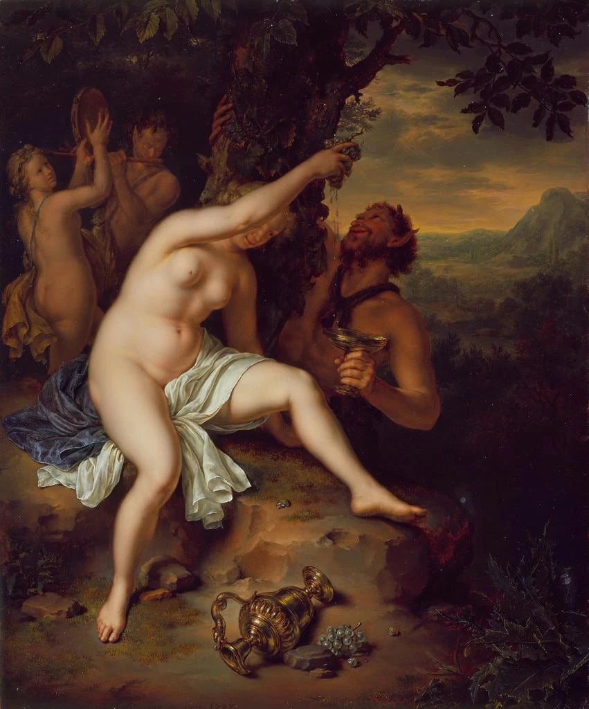 Der Stil von Willem van Mieris zeichnet sich durch eine außergewöhnliche Detailgenauigkeit und eine raffinierte Farbpalette aus. In "Scène bachique" wird jedes Element mit einer Präzision behandelt, die die Geschicklichkeit des Künstlers widerspiegelt. Die Gesichter der Figuren, ausdrucksstark und lebendig, fangen die Essenz der bachischen Euphorie ein. Die geschickt inszenierten Licht- und Schatteneffekte verleihen der Szene eine beeindruckende Tiefe und tauchen den Betrachter in eine sowohl intime als auch festliche Welt ein. Die Komposition, ausgewogen und harmonisch, lädt zur Betrachtung ein, wobei jeder Blick ein neues Detail oder eine neue Interaktion zwischen den Figuren entdeckt. Die Texturvielfalt, sei es bei den Drapierungen der Kleidung oder den natürlichen Elementen, verstärkt den Eindruck von Realismus, bewahrt jedoch eine gewisse Idealisierung, die typisch für barocke Kunst ist.