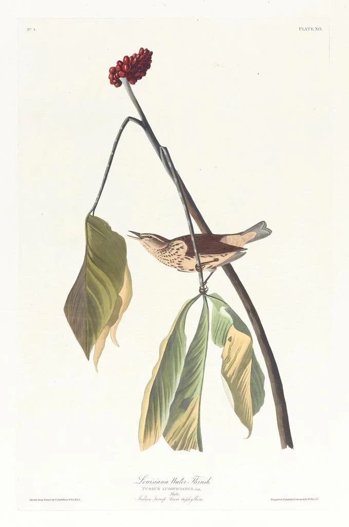 John James Audubon, Naturforscher und Künstler des 19. Jahrhunderts, gilt als einer der Pioniere der Ornithologie. Geboren in Haiti im Jahr 1785, wanderte er in die Vereinigten Staaten aus, wo er eine Leidenschaft für Vögel und deren Lebensraum entwickelte. Seine Werke, darunter der kunstdruck der Louisianischen Drossel, zeugen von sorgfältiger Beobachtung und tiefem Respekt vor der Natur. Audubon verstand es, Kunst und Wissenschaft zu verbinden, und schuf Illustrationen, die zu Referenzen im Bereich der Ornithologie wurden. Seine Arbeit hat nicht nur zum Wissen über Vogelarten beigetragen, sondern auch viele Künstler und Naturforscher seiner Zeit beeinflusst und ihn zu einer ikonischen Figur der romantischen Bewegung gemacht.