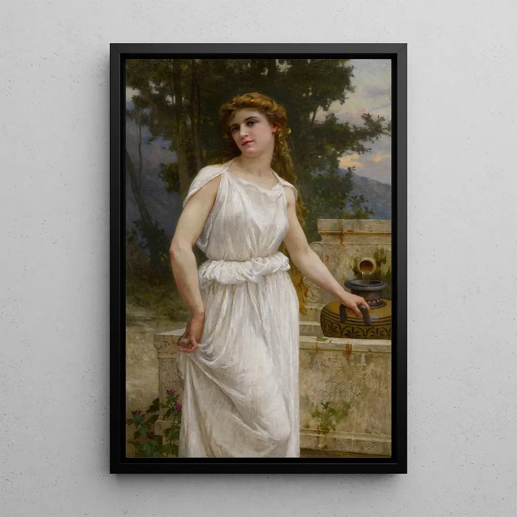À la fontaine : ein Moment der Gelassenheit und Schönheit À la fontaine, ein zartes Werk von Guillaume Seignac, fängt eine Szene voller Anmut und Ruhe ein. Die Komposition hebt eine junge Frau hervor, die ein leichtes Kleid trägt und sich einer Fontaine nähert, Symbol für Reinheit und Erneuerung. Die Pastellfarben, sanft und beruhigend, schaffen eine träumerische Atmosphäre, während das natürliche Licht die zarten Formen der weiblichen Figur zu streicheln scheint. Die Technik von Seignac, geprägt von einem beeindruckenden Realismus, lädt den Betrachter ein, diesen Moment der Gelassenheit zu teilen, in dem Natur und Mensch sich begegnen. Guillaume Seignac : die Kunst der weiblichen Schönheit Guillaume Seignac, französischer Maler des frühen 20. Jahrhunderts, ist bekannt für seine idealisierten Darstellungen der Frau. Beeinflusst von der akademischen Bewegung, verstand er es, Tradition und Moderne zu verbinden, und schuf Werke, die Schönheit und Anmut der Frau feiern. Sein Stil, oft mit dem der Impressionisten verglichen, zeichnet sich durch eine besondere Aufmerksamkeit für Details und Licht aus. Seignac hat die Essenz der Weiblichkeit eingefangen und seine Werke zu zeitlosen Zeugnissen der französischen klassischen Kunst gemacht. Seine Arbeit inspiriert und begeistert weiterhin Kunstliebhaber. Eine dekorative Anschaffung mit vielfältigen Vorzügen Die kunstdruck von À la fontaine ist ein dekoratives Stück, das Ihrem Raum eine Note von Raffinesse verleiht. Ob im Wohnzimmer, Büro oder Schlafzimmer, dieses Bild evoziert eine friedliche und einladende Atmosphäre. Die Qualität des kunstdrucks garantiert eine Treue zu den Nuancen und der Textur des Originalwerks, während es Ihrer Dekoration eine künstlerische Dimension hinzufügt. Dieses Bild, eine wahre Ode an die Schönheit, lässt sich mühelos in verschiedene Einrichtungsstile integrieren und ist eine bevorzugte Wahl für Kunst- und Naturliebhaber.