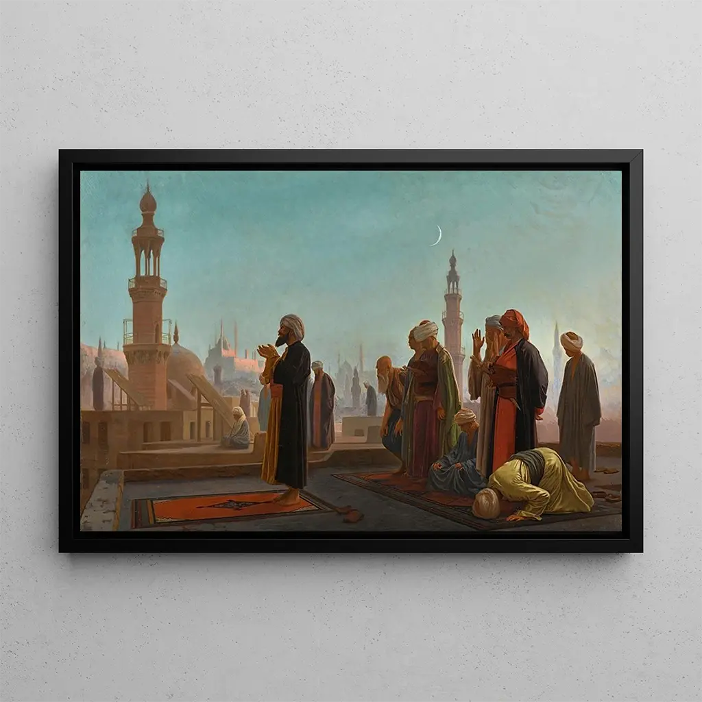 Gebet am Abend in Kairo: Ein Moment spiritueller Gelassenheit Die Leinwand "Gebet am Abend in Kairo" von Jean-Léon Gérôme fängt einen Moment der Hingabe in einem orientalischen Rahmen voller Geheimnis ein. Die warmen, goldenen Farben des Sonnenuntergangs vermischen sich mit den Schatten der Silhouetten und schaffen eine Atmosphäre, die sowohl intim als auch majestätisch ist. Gérôme, Meister der Details, verwendet eine realistische Technik, um der Schönheit der Kostüme und Architekturen Tribut zu zollen. Die Figuren, in ihr Gebet vertieft, scheinen Zeit und Raum zu transzendieren und laden den Betrachter ein, über Spiritualität und inneren Frieden nachzudenken. Dieses Werk ist ein wahres Fenster zu einer Welt voller Traditionen und Emotionen. Jean-Léon Gérôme: der Virtuose des orientalischen Realismus Jean-Léon Gérôme, geboren 1824, ist einer der bedeutendsten Künstler der orientalistischen Bewegung. Seine Karriere, geprägt von Reisen im Orient, ermöglichte es ihm, exotische Themen und Szenen des Alltagslebens in Ländern wie Ägypten und der Türkei zu erkunden. Beeinflusst von Neoklassizismus und Romantik, verstand Gérôme es, technische Präzision mit künstlerischer Sensibilität zu verbinden. Seine Werke, oft voller Symbolismus, zeugen von tiefem Respekt für die Kulturen, die er darstellt. "Gebet am Abend in Kairo" ist ein perfektes Beispiel für sein Talent, eine treue Darstellung mit einer spirituellen und kontemplativen Atmosphäre zu verbinden. Eine dekorative Anschaffung mit vielfältigen Vorzügen Die Wahl einer kunstdruck von "Gebet am Abend in Kairo" für Ihren Wohnraum ist eine inspirierende Entscheidung. Dieses Gemälde, mit seiner visuellen Reichtum und seiner beruhigenden Atmosphäre, fügt sich harmonisch in verschiedene Dekors ein, sei es im Wohnzimmer, in einer Bibliothek oder im Büro. Die Qualität des kunstdrucks garantiert eine Treue zu den Details und ermöglicht es, die Tiefe des Originalwerks zu spüren. Seine ästhetische Anziehungskraft, verstärkt durch die warmen Farben und die spirituelle Szene, macht es zu einem dekorativen Element, das Bewunderung hervorruft und zum Nachdenken einlädt. Durch die Hinzufügung dieses Leinwandbildes zu Ihrer Sammlung bringen Sie einen Hauch Exotik und Gelassenheit in Ihr Zuhause.