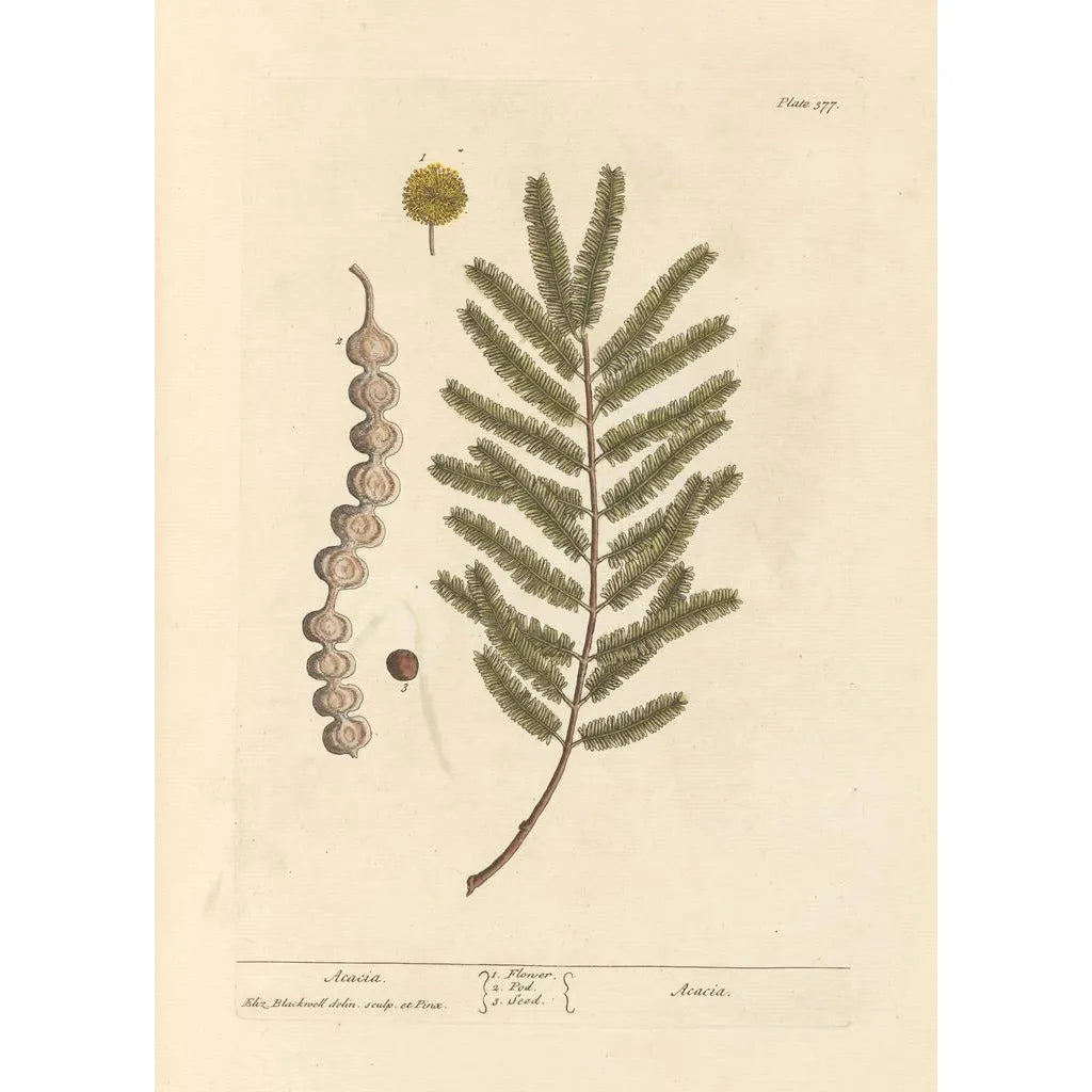 Das Werk Acacia von Elizabeth Blackwell ist eine wahre Feier der floralen Schönheit. Die zarten Nuancen von Grün und Gelb verschmelzen harmonisch und schaffen eine beruhigende sowie belebende Atmosphäre. Die Kupferstichttechnik, die von der Künstlerin verwendet wird, ermöglicht es, die feinen Details der Blätter und Blumen mit bemerkenswerter Präzision einzufangen. Jedes Element der Komposition scheint unter dem Licht zu vibrieren und lädt den Betrachter ein, in eine Welt einzutauchen, in der die Natur in ihrer ganzen Pracht erblüht.