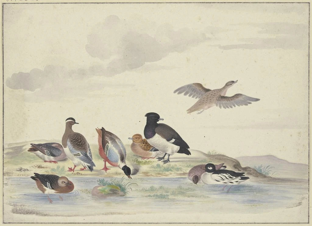 Acht Enten verschiedener Arten am Wasserufer - Pieter Holsteijn