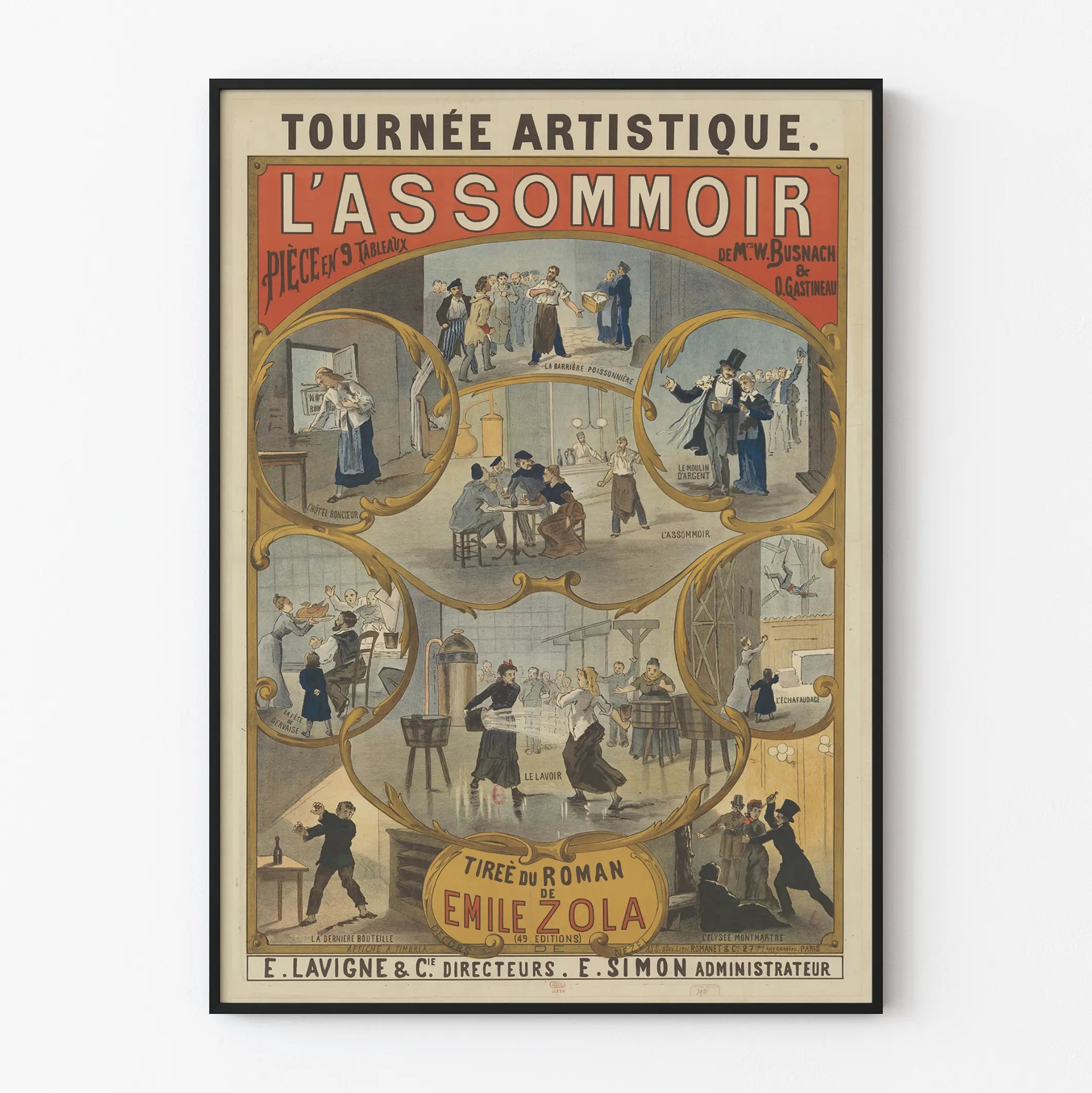 Entdecken Sie dieses alte Plakat, das die künstlerische Tournee des Theaterstücks L'Assommoir zeigt, basierend auf dem berühmten Roman von Émile Zola. Diese Vintage-Wanddekoration hebt neun zentrale Szenen des Stücks hervor, mit Titeln wie La Barrière Poissonnière, L'Hôtel Boncoeur, Le Moulin d'Argent, Le Lavoir, La Fête de Gervaise, L'Échafaudage, La Dernière Bouteille und L'Élysée Montmartre. Es ist im grafischen Stil der Epoche gestaltet, typisch für Theaterplakate, wobei die Harmonie der Farben Rot, Beige und Pastellblau einen nostalgischen Charme verleiht. Dieses Plakat ist ein ideales Wanddekorationselement für Liebhaber französischer Literatur, Theater oder historischer Gestaltung. Es bringt eine historische und kulturelle Note in Ihr Zuhause, egal ob gerahmt als Poster oder als Wandbild. Solch ein dekoratives Objekt ist perfekt, um eine künstlerische und literarische Atmosphäre zu schaffen, insbesondere im Wohnzimmer, in einer Bibliothek oder im Büro. Durch seine gezeichneten Szenen lädt das Plakat dazu ein, die soziale und dramatische Atmosphäre des naturalistischen Romans von Émile Zola wiederzuerleben, während es den grafischen Stil der künstlerischen Darstellungen des späten 19. Jahrhunderts betont. Ein detailreiches Wandplakat, ideal für eine originelle und authentische Wanddekoration.