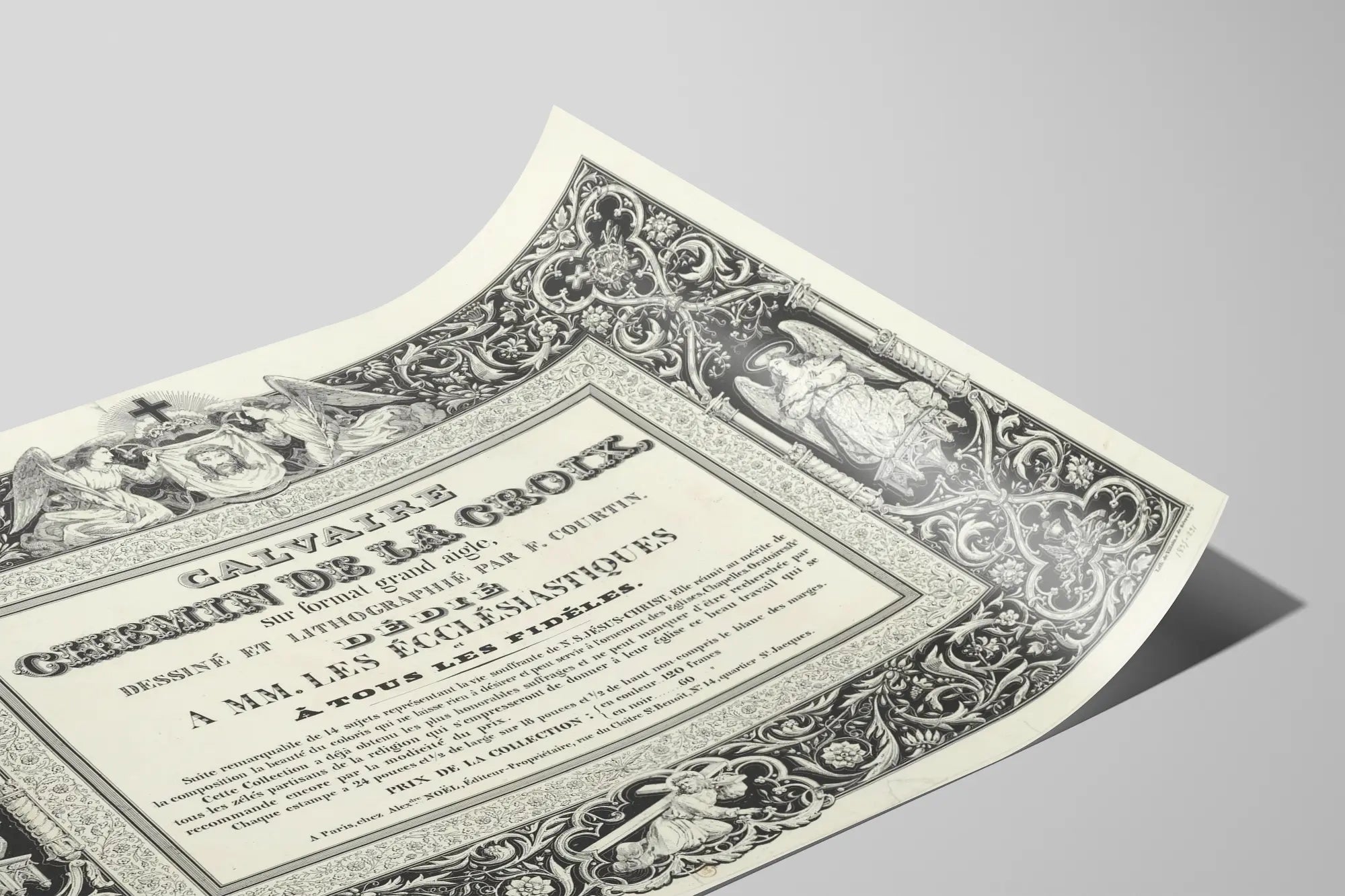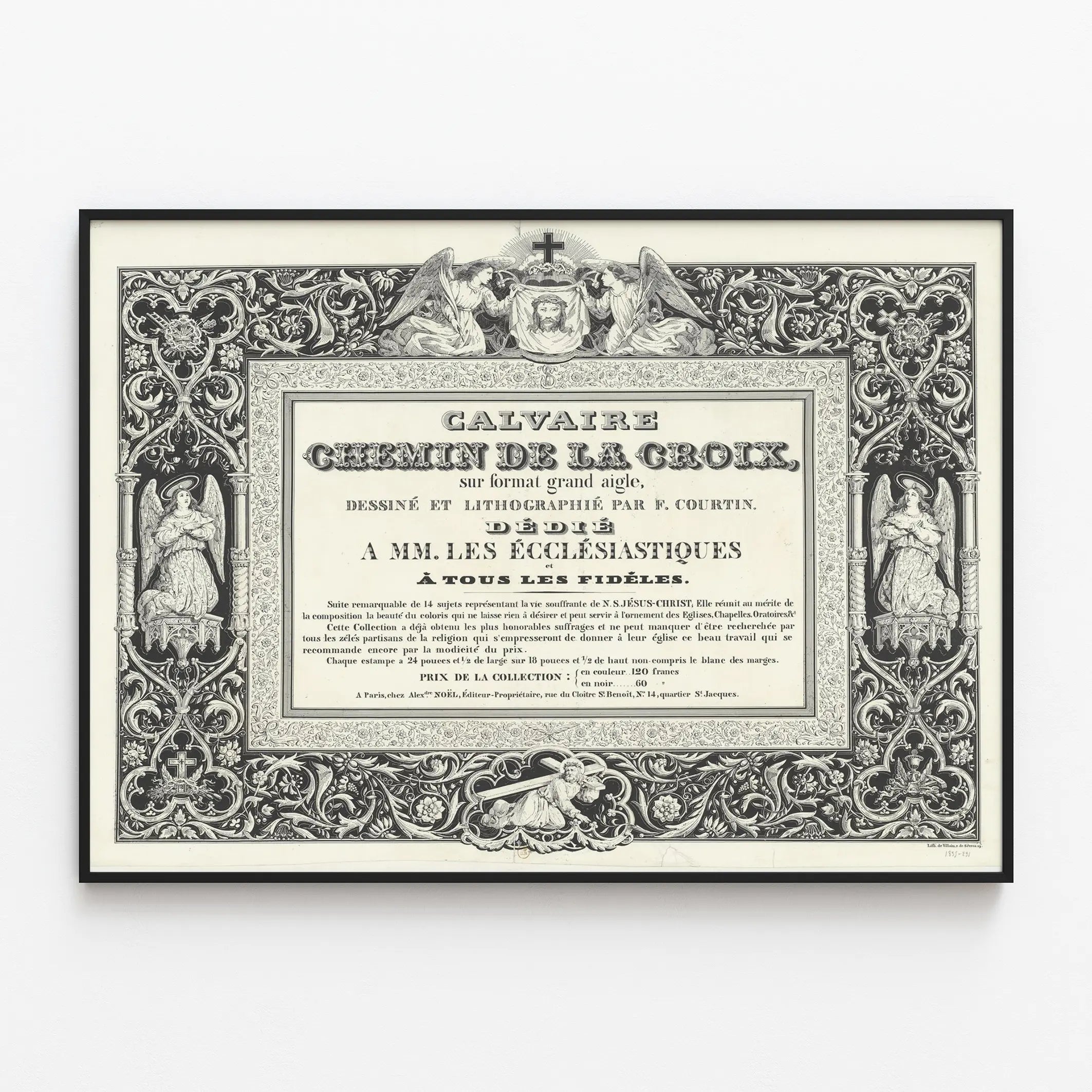 Entdecken Sie dieses elegante Plakat mit dem Titel "Calvaire Chemin de la Croix", eine detaillierte Lithographie, entworfen von F. Courtin, die eine reichhaltige Komposition voller religiöser Symbole bietet. Dieses monumentale Poster, gestaltet im Großformat, zeigt einen komplexen ornamentalen Rahmen, gefüllt mit Engeln, Blumendekoren und spirituellen Elementen wie dem Kreuz und der Dornenkrone. Im Zentrum wird der Titel von fein ausgearbeiteten Illustrationen eingerahmt, die den heiligen und feierlichen Charakter dieses Werkes unterstreichen. Diese Wanddekoration ist ein visuelles Zeugnis der Passion Christi, dargestellt durch eine bemerkenswerte Serie von 14 Szenen, die das leidvolle Leben Jesu schildern. Ihr klassischer Stil und die sorgfältige Schwarz-Weiß-Darstellung machen sie zu einem idealen Stück für einen Ort der Anbetung, eine Kapelle oder jeden Raum für Meditation und Kontemplation. Dieses religiöse Poster, das sowohl Geistliche als auch alle Gläubigen anspricht, zeichnet sich durch die Liebe zum Detail aus – von der Typografie bis zu den dekorativen Rahmen, die das Ganze zu einem harmonischen Kunstwerk verbinden. Dieses Wandbild ist ein kraftvolles Dekorationselement, das die Inneneinrichtung bereichern und gleichzeitig eine spirituelle und künstlerische Dimension hinzufügen kann. Ob zur Erweiterung einer Sammlung religiöser Gegenstände oder zur Verschönerung einer Wand mit einem Werk, das sowohl historisch als auch ästhetisch ist – das Calvaire Chemin de la Croix Poster besticht durch seine Authentizität und feine Ausführung. Es richtet sich sowohl an Liebhaber religiöser Kunst als auch an Sammler alter Lithographien, die ein bedeutungsvolles Stück in ihre Wanddekoration integrieren möchten. Verleihen Sie Ihrem Raum eine Note spiritueller Erhebung mit diesem Wandbild, dessen grafische Schönheit und Symbolik Respekt und Andacht wecken werden.