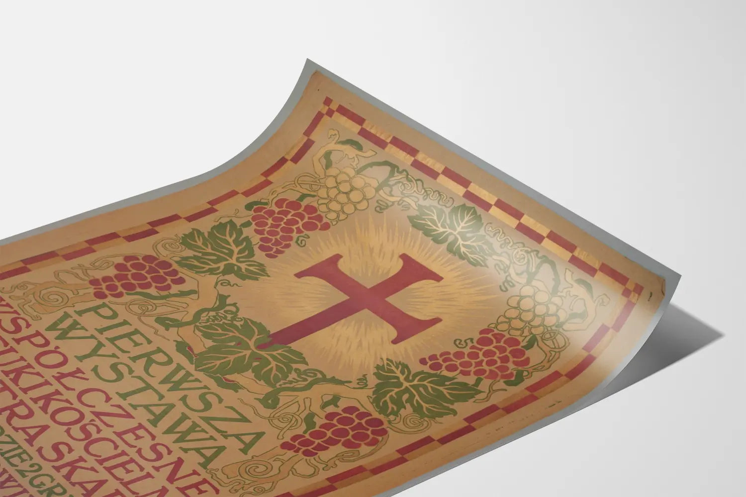 Dieses alte und dekorative Plakat würdigt die erste Ausstellung zeitgenössischer religiöser Kunst, die 1911 in Krakau dem Künstler Piotr Skarga gewidmet war. Es stellt ein einzigartiges Wanddekorationselement dar, das religiöse Motive mit stilisierten künstlerischen Elementen verbindet. Die Zeichnung zeigt ein zentrales Kreuz, umgeben von einem leuchtenden Heiligenschein, der das göttliche Licht symbolisiert. Um das Kreuz herum schmücken Trauben und Weinblätter das Plakat und erinnern an die traditionellen Themen der Eucharistie und des christlichen Symbols des Weins.