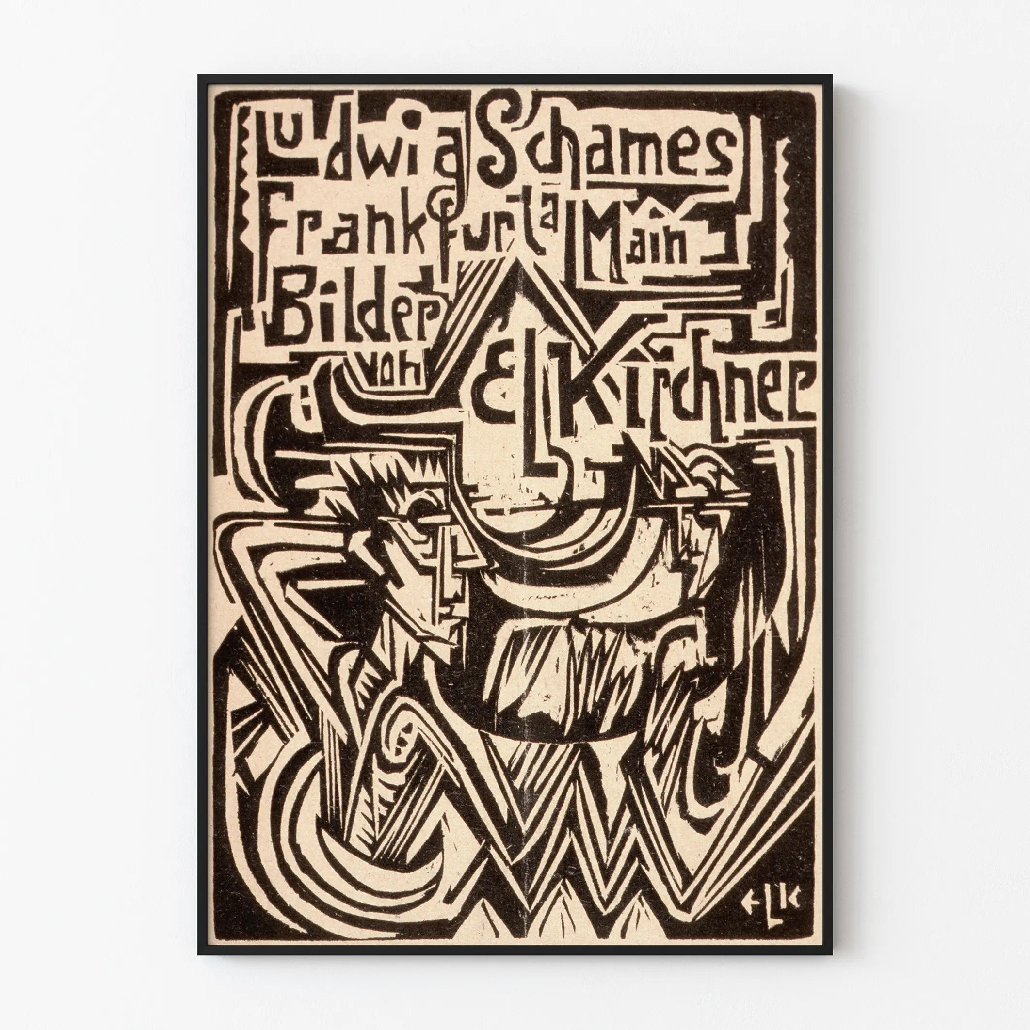 Dieses künstlerische Poster in Linolschnitt zeigt einen grafischen Stil mit starken kubistischen Akzenten, mit geometrischen Formen und schwarzen Linien auf hellbeigem Hintergrund. Die Komposition drückt ein feines Gleichgewicht zwischen Text und Bildern aus, verbindet Typografie und abstrakte Muster in einer komplexen und stilisierten Szenografie. Die eng aneinandergereihten und integrierten Zeichen, die vom oberen Rand des Werks bis zur Mitte reichen, bilden ein harmonisches Ganzes, in dem Wörter wie „Ludwig Schames“, „Frankfurt am Main“, „Bilder“ und „Kirchner“ lesbar sind. Dieses Poster, sowohl dekorativ als auch ausdrucksstark, spricht eine retro- und modernistische Ästhetik an, die von visueller Ausdruckskraft geprägt ist. Es ist eine ausgezeichnete Wahl für alle, die eine originelle, grafische Wanddekoration mit Charakter suchen, die einen modernen Innenraum, ein kreatives Büro oder eine persönliche Galerie bereichern kann. Dieses typografische und geometrische Bild setzt einen starken künstlerischen Akzent, ideal für Liebhaber von Gravuren und abstrakter Kunst. Mit Symbolen, Buchstaben und skulpturalen Formen lädt dieses Werk in Schwarz-Weiß zu einer aufmerksamen Betrachtung und einer visuellen Reise ein. Wandposter, das sowohl expressiv als auch schlicht ist, passt sich mühelos verschiedenen Einrichtungsstilen an, vom zeitgenössischen bis zum industriellen. Als Symbol für eine gekonnte Balance zwischen Text und Grafik ist dieses Poster eine Wanddekoration, die traditionelles Handwerk mit künstlerischer Modernität verbindet.