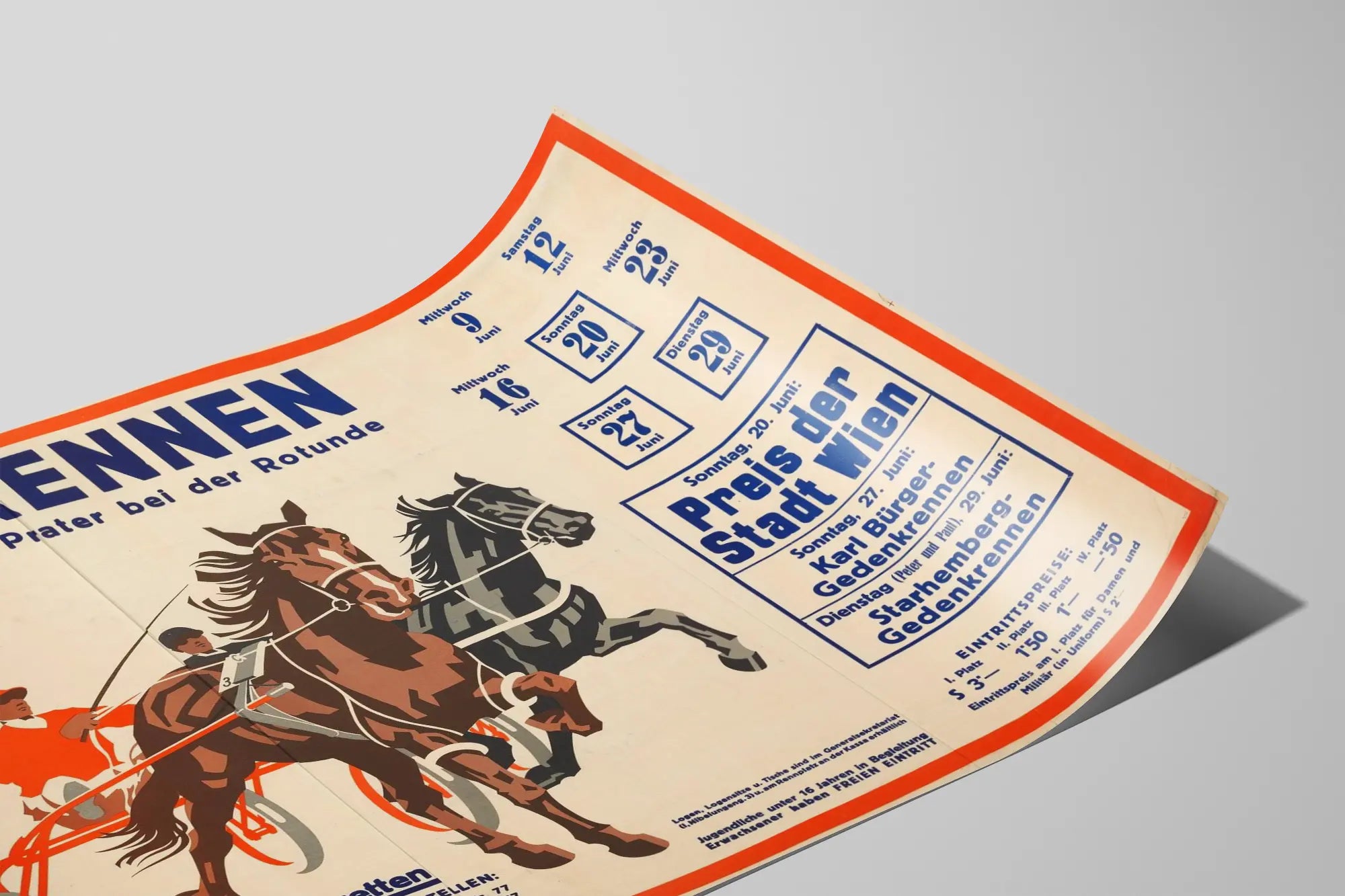 Le texte en allemand rappelle les dates des rendez-vous hippiques, renforçant l’aspect authentique et historique de cette pièce. Les inscriptions détaillent également les horaires et des informations sur les paris, ce qui ajoute à la valeur narrative de l’affiche.