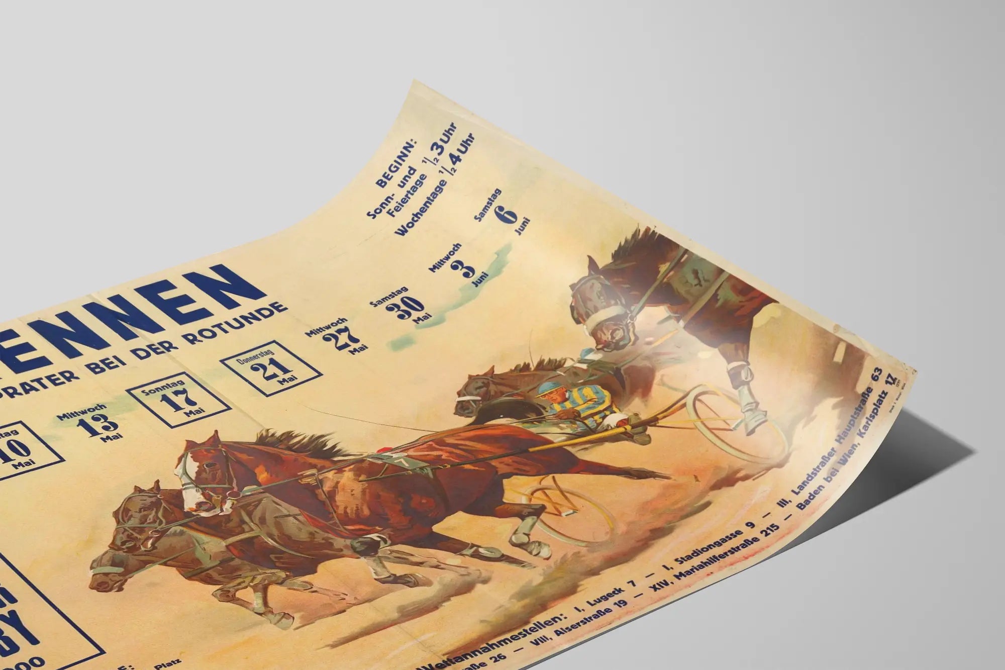 Cette affiche vintage annonce un événement de course de trot appelé 'Trabrennen' qui se tient sur le Trabrenn-Platz dans le Prater, près de la Rotonde. Elle présente une illustration dynamique de chevaux de trot attelés, en pleine course, avec leurs jockeys concentrés, ce qui en fait une décoration murale idéale pour les amateurs de sports équestres ou de motifs vintage. Le style graphique, aux couleurs chaudes et au rendu authentique, sublime le mouvement et la puissance des chevaux tout en évoquant l'ambiance des courses hippiques historiques. La composition du poster est centrée autour de la course, avec des informations détaillées sur les dates des courses de mai et juin, mettant en avant un événement spécial, le 'Österr. Traber Derby' du dimanche 17 mai, avec une prime indiquée. Les horaires de début varient selon les jours, précisés en haut à droite, ce qui ajoute une touche d'authenticité à cette affiche. En plus de son attrait visuel, cette affiche ancienne est un élément parfait pour enrichir une décoration murale sur un thème sportif, vintage ou rétro. Elle se prête très bien à être affichée dans un salon, un bureau ou une salle de jeux, apportant une touche d'histoire et de dynamisme. Son graphisme précis et ses inscriptions détaillées en allemand renforcent l'aspect décoratif tout en invitant à la découverte culturelle. Idéal comme poster ou affiche à encadrer, ce visuel authentique est aussi parfait pour un cadre professionnel comme un cabinet lié au sport, un restaurant ou un bar faisant référence aux courses hippiques. Il s'agit d'une pièce unique qui combine aspect artistique et information historique sur les courses au Prater. Enfin, cette décoration murale est un clin d'œil aux passionnés d'équitation, de courses hippiques et d'illustrations anciennes, offrant une ambiance chaleureuse et sportive à votre intérieur.