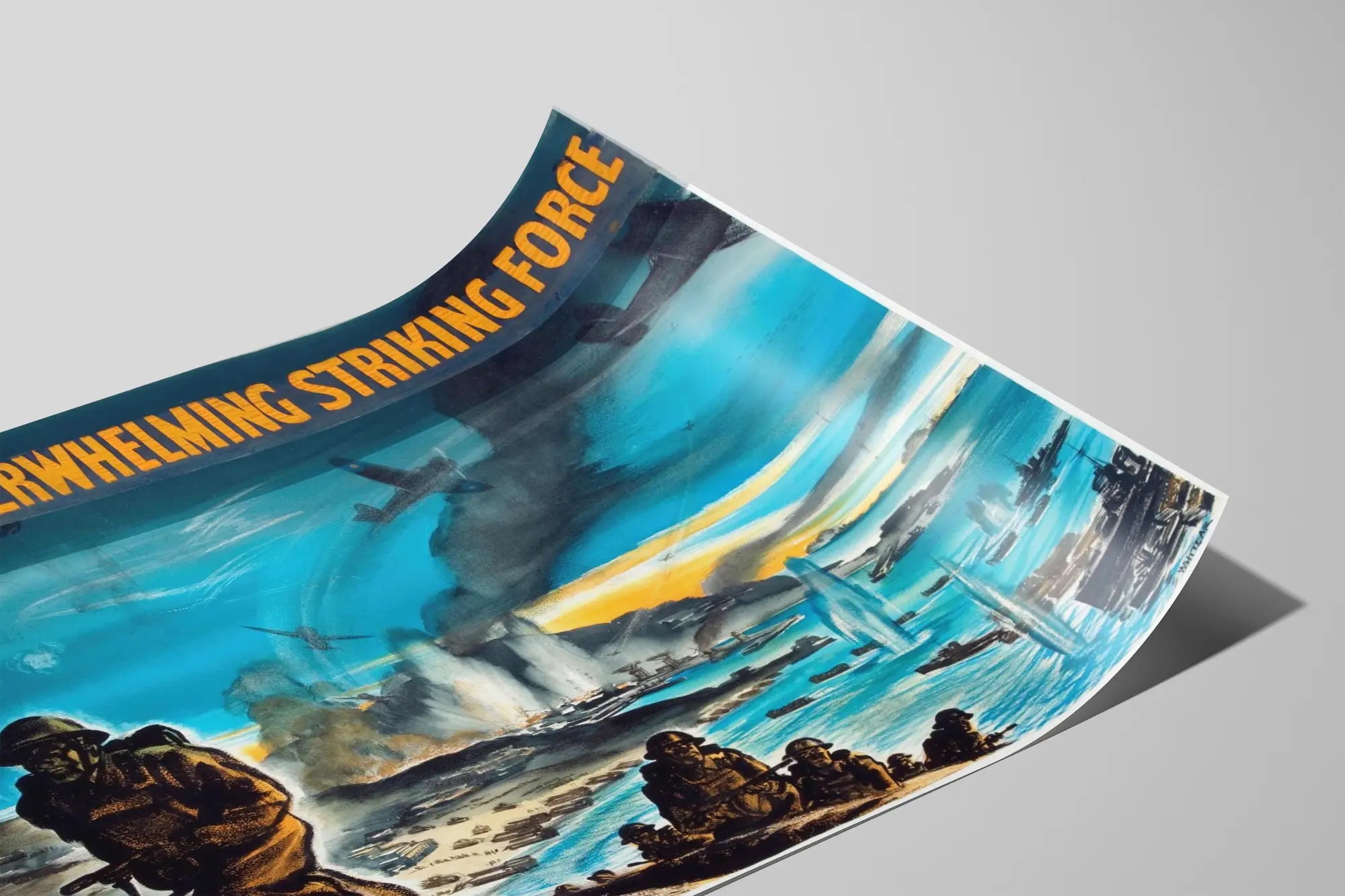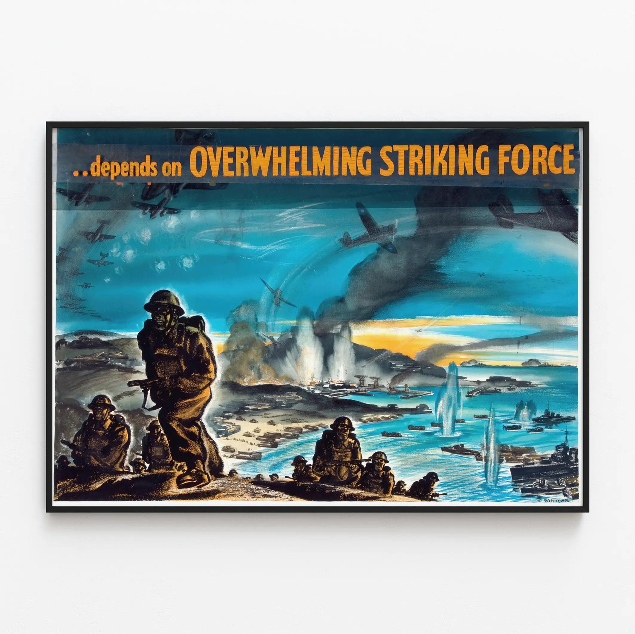 Cette affiche vintage de décoration murale capture une scène militaire intense mettant en avant une force de frappe écrasante. Au premier plan, elle présente un groupe de soldats en marche, prêts au combat, ce qui confère à cette affiche un aspect dramatique et puissant. Le paysage s'étend vers une baie où de nombreux navires de guerre sont visibles, tandis que des explosions et des nuages de fumée soulignent l'intensité de l'action. Dans le ciel, des avions militaires évoluent au-dessus du champ de bataille, renforçant l'impression de mouvement et de conflit. Le texte en haut de l'affiche, en lettres jaunes sur fond sombre, souligne l'importance de la force de frappe écrasante, ce qui en fait une pièce inspirante pour les passionnés d'histoire militaire ou pour une décoration murale à thème historique. Cette affiche peut être utilisée comme un poster décoratif pour apporter une ambiance intemporelle, évoquant la stratégie et la puissance militaire. Son style graphique distinctif et ses couleurs contrastées apportent une touche d'authenticité et de dynamisme à tout intérieur. Idéale pour une salle de séjour, un bureau ou un espace dédié à la collection d'objets historiques, cette affiche représente l'énergie et le suspense des opérations militaires. C'est un élément de décoration murale unique qui combine illustration, texte évocateur et composition équilibrée, pour un rendu visuel saisissant.