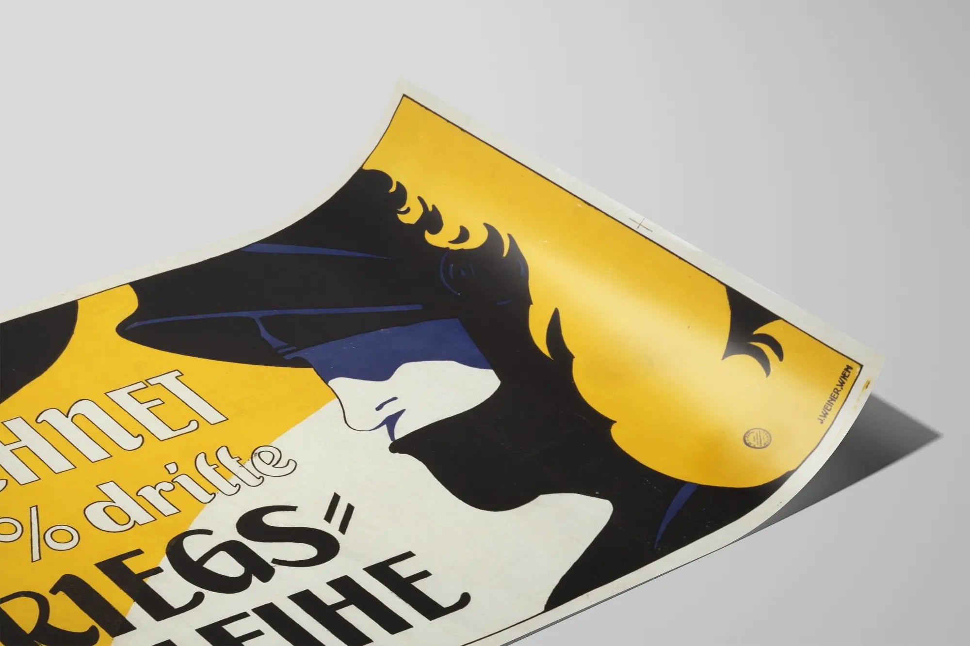 Découvrez cette affiche vintage de propagande allemande intitulée « Zeichnet 5½ % dritte Kriegsanleihe », une pièce de décoration murale au style graphique saisissant. Ce poster se caractérise par une palette de couleurs limitée mais impactante, mêlant le jaune vif, le noir profond et des touches de bleu, qui mettent en valeur le profil d'une silhouette stylisée. L'affiche combine un fort contraste visuel et une typographie expressive qui attire l'œil sur le message principal, présentant un texte en allemand en grandes lettres : « Zeichnet 5½ % dritte Kriegsanleihe », ce qui correspond à un appel à souscrire une troisième obligation de guerre avec un rendement de 5,5%. Cette affiche représente un exemple typique d'art graphique de propagande historique, utilisé pour mobiliser le soutien financier pendant une période de conflit. Idéale pour une décoration murale vintage, elle convient parfaitement pour orner un salon, un bureau ou un espace dédié à l'histoire et au design rétro. En plus de son aspect décoratif, ce poster invite à une réflexion sur l'histoire visuelle et les moyens de communication d'époque. Les lignes épurées et les formes stylisées en font une œuvre graphique qui s'intègre aisément dans un intérieur contemporain ou classique. Ce tableau mural apporte une touche d'authenticité et d'intensité visuelle grâce à son style minimaliste mais puissant. Cette affiche est un choix remarquable pour les amateurs d'art historique, de décoration murale vintage ou pour ceux cherchant à enrichir leur collection avec un poster chargé de sens et d'impact visuel. Ajoutez une pièce forte et originale à votre décoration murale avec cette affiche historique qui capte l'attention et stimule la curiosité.