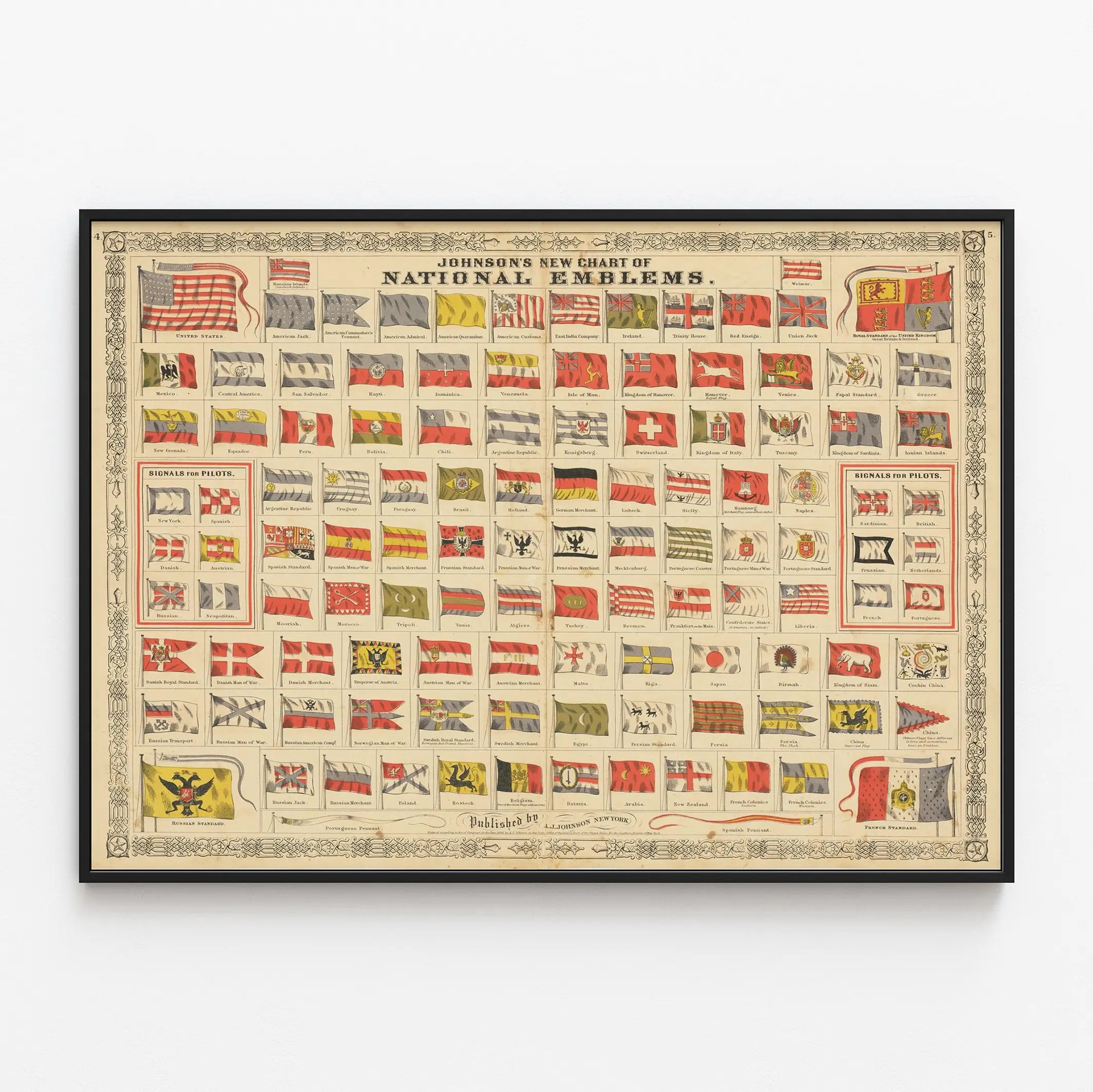 Découvrez cette affiche vintage exceptionnelle intitulée « Johnson's New Chart of National Emblems », une décoration murale raffinée idéale pour les passionnés d'histoire, de géopolitique ou de design rétro. Ce poster réunit un large éventail de drapeaux et emblèmes nationaux historiques, offrant une représentation visuelle détaillée de nombreux pays et territoires. Conçue dans un style ancien, cette affiche met en avant les symboles nationaux avec une précision graphique qui évoque les cartes maritimes ou les chartes nationales du 19ème siècle.