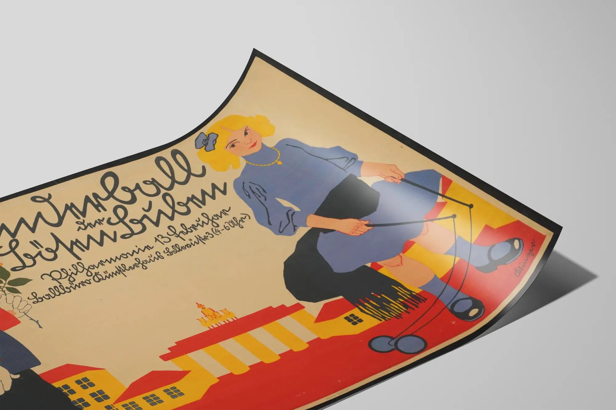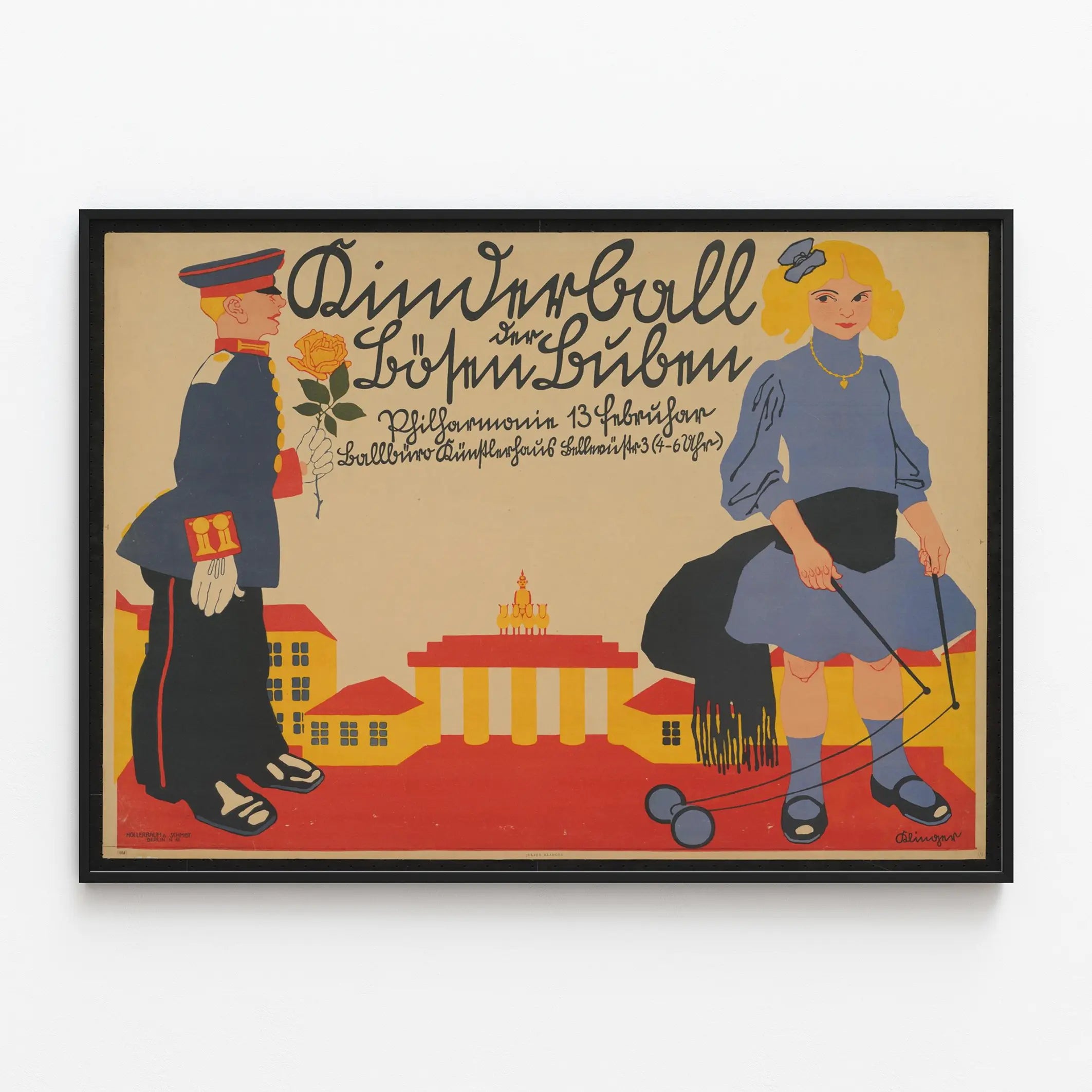Cette affiche vintage illustre une scène enfantine pleine de charme, mettant en scène un garçon en uniforme militaire tenant une rose, face à une fillette jouant avec un diabolo. Aux couleurs vives et contrastées dominées par le bleu, le rouge, le jaune et le beige, cette décoration murale évoque un univers rétro avec un style graphique simple mais expressif. Le garçon, habillé d'un uniforme bleu foncé rehaussé de boutons dorés et de détails rouges, symbolise la discipline et l'ordre, tandis que la fillette en robe bleue agrippant les ficelles de son diabolo invite à la douceur et au jeu. Le décor stylisé en arrière-plan rappelle des architectures classiques aux tons chauds, renforçant l'aspect historique et nostalgique de l'affiche. Le texte manuscrit en haut de la composition, en allemand, accentue le caractère authentique et typographique de cette œuvre graphique. Cette affiche vintage est idéale comme élément de décoration murale dans un intérieur au style rétro, une chambre d'enfant ou un espace dédié à la nostalgie et aux souvenirs d'enfance. Elle offre un équilibre visuel marqué par les contrastes entre figures et arrière-plan et apporte une touche d'originalité et d'histoire à toute pièce. Ce poster séduit par son approche artistique ludique et traditionnelle, parfait pour enrichir un mur d'une ambiance à la fois douce et colorée.