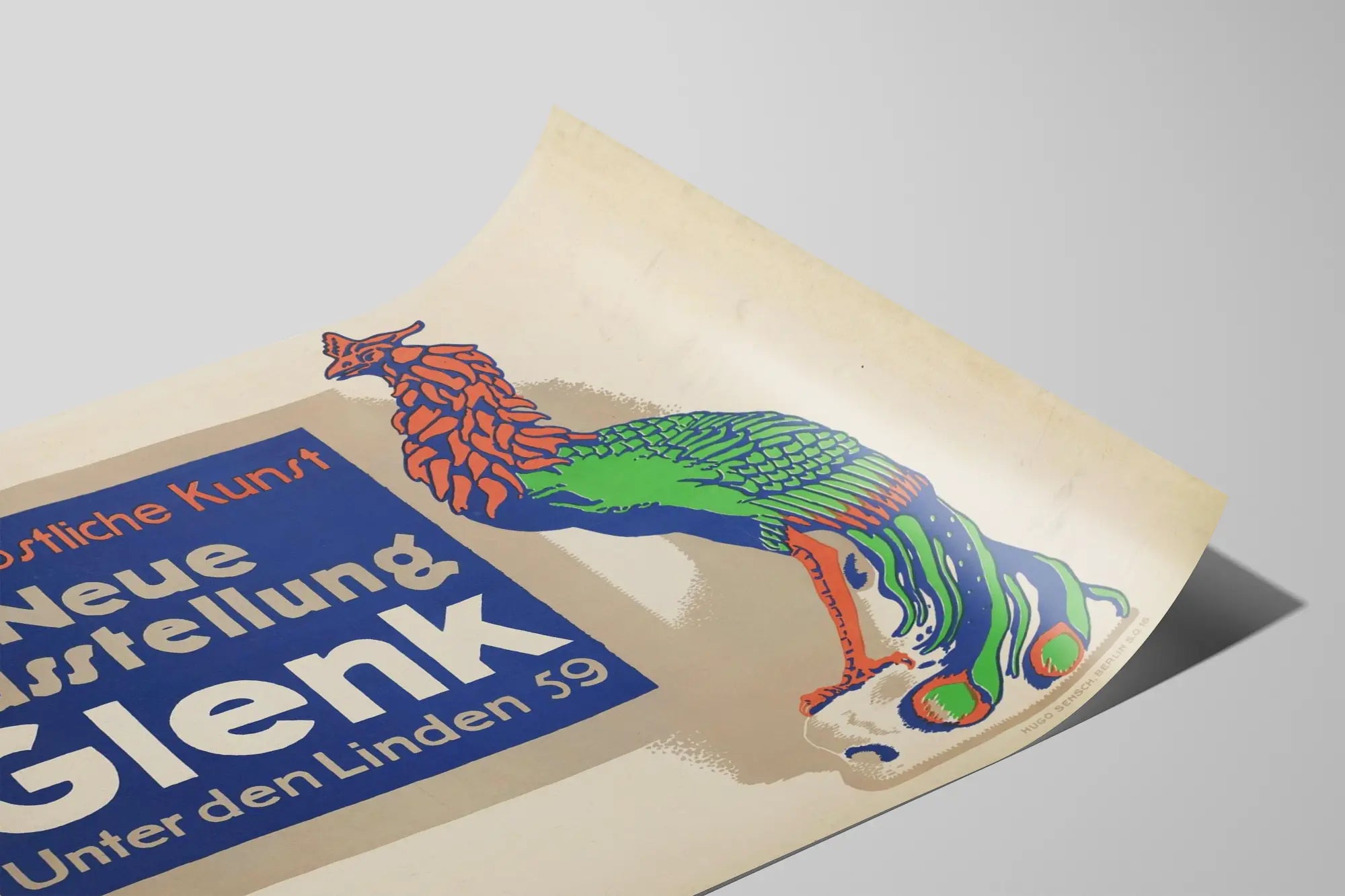 Découvrez cette affiche vintage unique promouvant une exposition d'art antique oriental, intitulée « Neue Ausstellung Glenk ». Ce poster ancien présente une composition graphique typique du design d'exposition, mêlant typographie marquée et illustration stylisée. Cette décoration murale met en scène un oiseau coloré aux teintes vives comme l’orange, le vert et le bleu, rappelant l'esthétique de l'art ancien de l'Orient. La mise en page est dominée par un fond beige sur lequel ressort un cadre bleu contenant le texte principal en lettres claires, tandis que le dessin de l'oiseau vient animer l'ensemble en apportant une touche de dynamique et de couleur. Cette affiche, signée Max Ettler, est un bel exemple de la décoration murale rétro, idéale pour les amateurs d'histoire de l'art et de design graphique. Elle s'intègre parfaitement dans un intérieur dont la décoration mise sur un style vintage ou ethnique. Son graphisme épuré et son aura historique en font un tableau mural original, apportant profondeur et caractère à votre espace. Que ce soit pour une salle d'exposition, un bureau ou un salon, ce poster saura captiver le regard tout en insufflant une ambiance artistique liée à l'Antiquité orientale. Par son style typiquement années 20-30, ce produit de décoration murale conserve une esthétique intemporelle et authentique, faisant de lui un choix remarquable pour personnaliser vos murs avec une touche culturelle et artistique. Cette affiche est également un superbe cadeau pour les passionnés d'art ou les collectionneurs à la recherche d’une pièce distinctive. Offrez à vos murs cette représentation d’une exposition d’art antique qui allie histoire et décoration, pour un intérieur résolument inspiré et raffiné.