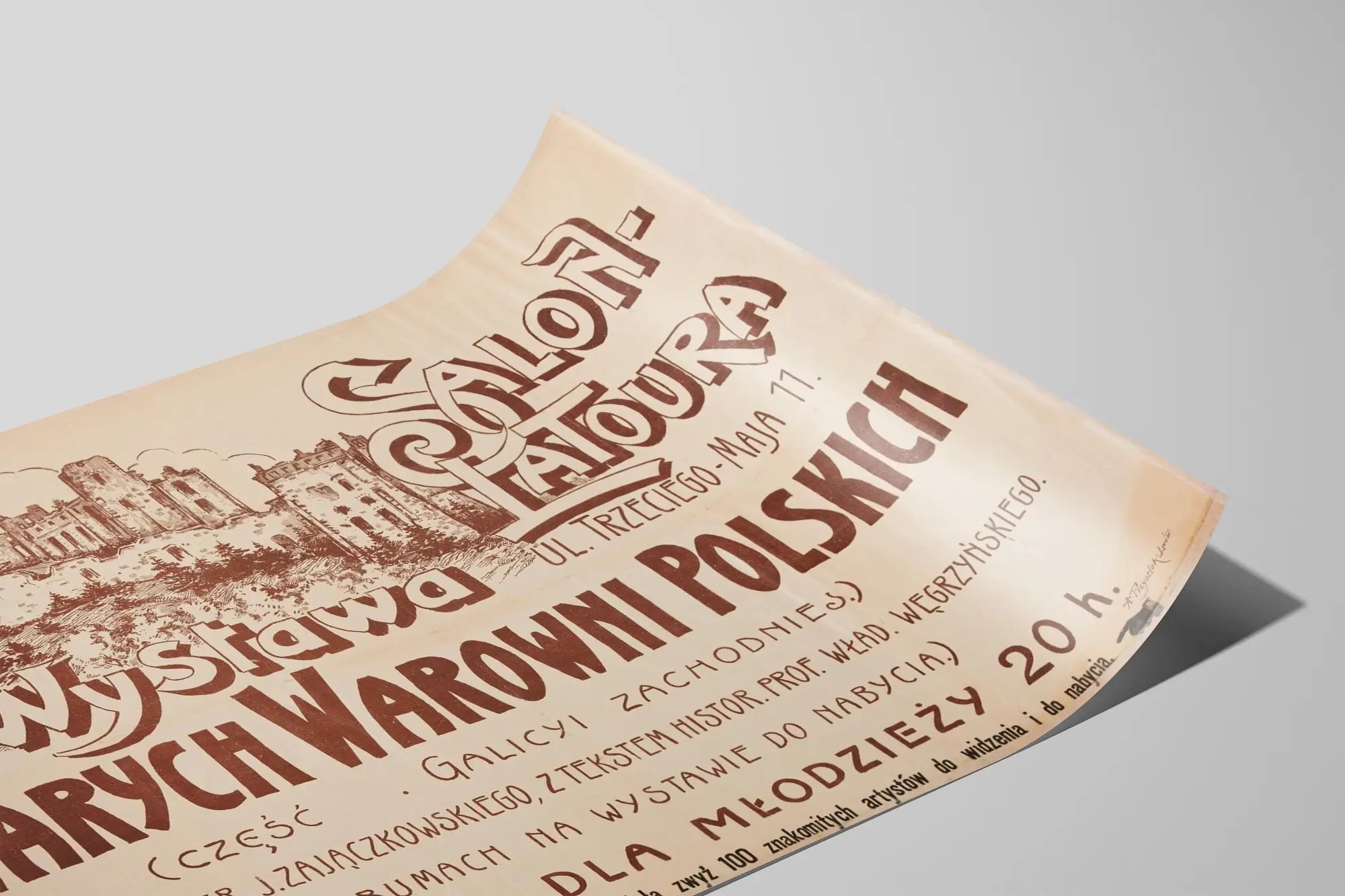 Découvrez cette affiche vintage captivante présentant l'exposition des anciennes forteresses polonaises, spécifiquement celles de la région de Galicie occidentale. Cette décoration murale typographique et illustrée met en avant un dessin détaillé d'un château en ruines entouré de végétation, offrant un style ancien et historique unique. Le style graphique en nuances sépia renforce le côté ancienne affiche d'exposition, idéale pour les passionnés d'histoire, d'architecture médiévale ou de décoration murale originale. Ce poster ancien publicitaire mentionne également la participation du photographe J. Zajączkowski et l'expertise historique du professeur Władysław Węgrzyński, ce qui ajoute une profondeur intellectuelle à cette pièce visuelle. Parfait pour orner un mur de bureau, salon ou bibliothèque, il apportera une touche d'authenticité et d'élégance rustique à votre décoration intérieure. Une œuvre murale avec du caractère, reflétant l'art des affiches anciennes et la richesse du patrimoine polonais. Cette affiche se distingue notamment par la typographie manuscrite en grosses lettres ainsi que par les détails architecturaux dessinés à la main, faisant d'elle un choix original comme poster décoratif mural. Idéale pour les amateurs d'art graphique traditionnel et de tableaux muraux évoquant le passé historique européen.
