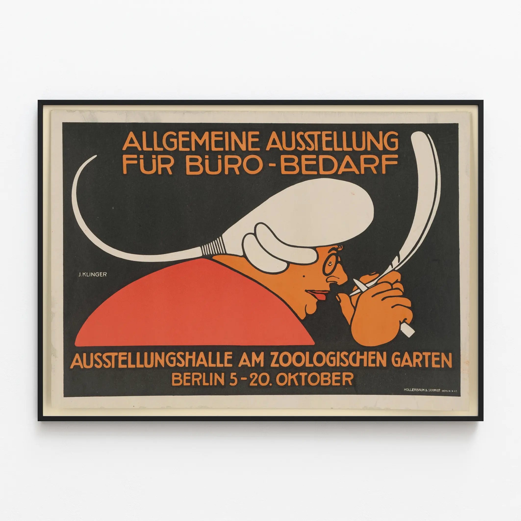 Cette affiche vintage au design graphique distinctif est une décoration murale idéales pour les amateurs de posters rétro et d'art affichiste. Représentant un profil caricatural aux couleurs vives, cette affiche sur fond noir combine une palette contrastée avec des teintes dominantes d'orange et de blanc. Le personnage stylisé semble écrire à la plume, symbole d'un temps où les fournitures de bureau classiques étaient à l'honneur. Le texte en allemand, aux lettres orange audacieuses, indique une exposition générale dédiée aux fournitures de bureau (Allgemeine Ausstellung für Bürobedarf), qui se déroulait à Berlin, soulignant un événement professionnel lié aux outils et accessoires de bureau. Ce poster mural offre un style graphique vintage typique des affiches publicitaires du début du XXe siècle, il s’intègre parfaitement dans une décoration industrielle ou bureau créatif. Suspendu dans un espace de travail, il apportera une touche d’élégance artistique et d’histoire à votre décoration intérieure. La composition équilibrée entre l’illustration et le texte fait de cette affiche un objet décoratif authentique, à la fois esthétique et évocateur d’un univers professionnel passé. Que ce soit dans un bureau, une salle d’exposition ou un lieu dédié à la décoration murale vintage, ce poster est un choix parfait pour ceux qui souhaitent allier design graphique ancien et ambiance professionnelle. Cette œuvre signée J. Klinger est aussi une belle pièce pour les collectionneurs d'affiches historiques liées aux arts graphiques et à la publicité. En somme, cette affiche représente bien plus qu’un simple support de communication : c’est un tableau mural à part entière qui sublime le thème des fournitures de bureau tout en proposant un style décoratif unique et puissant.