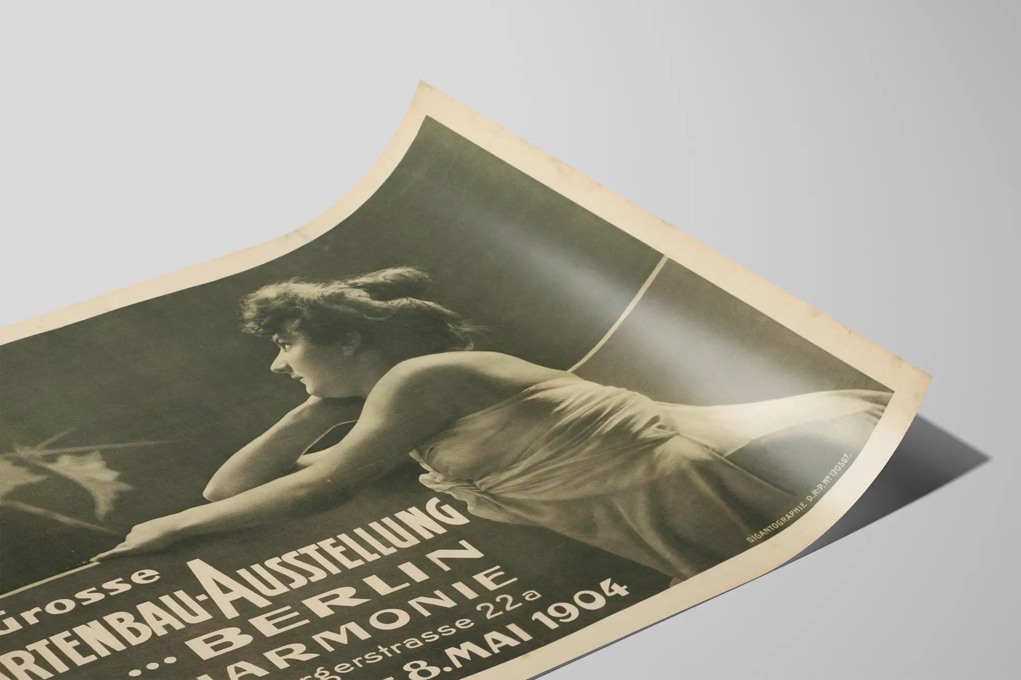 Découvrez cette affiche vintage exceptionnelle représentant la "Grosse Gartenbau Ausstellung Berlin" qui a eu lieu à la Philharmonie de Berlin, du 29 avril au 8 mai 1904. Cette décoration murale en style rétro illustre une femme élégamment drapée, évoquant une atmosphère douce et nostalgique, parfaitement adaptée aux amateurs d'art ancien et d'expositions horticoles historiques. Ce poster est une invitation au voyage dans le temps, capturant l'essence d'un événement culturel majeur du début du XXe siècle dédié au jardinage et à l'horticulture. Ce tableau mural, riche en détails artistiques, est un choix idéal pour embellir un intérieur avec une touche d'authenticité et d'histoire. Son design monochrome et sa typographie ancienne en font une affiche décorative distinctive, parfaite pour une collection d'affiches vintage ou pour créer une ambiance artistique et élégante dans n'importe quelle pièce. Apportez une pièce unique de décoration murale avec ce poster historique, symbole de l'art graphique et de la tradition horticole berlinoise.
