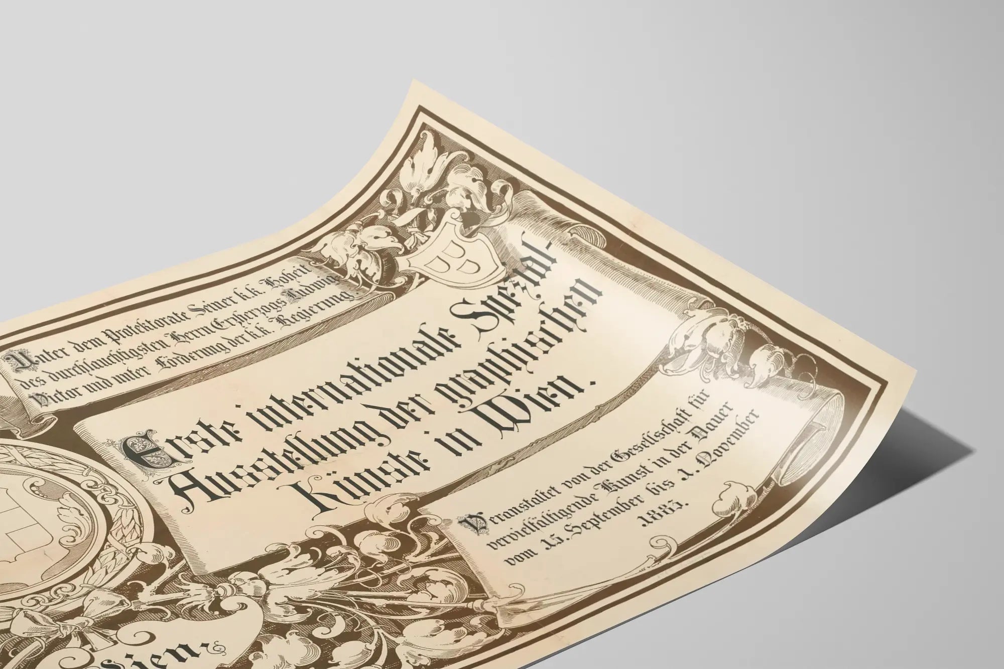 Découvrez cette affiche vintage unique représentant la première exposition internationale spécialisée en arts graphiques à Vienne en 1883. Cette décoration murale d'époque est un véritable témoignage historique encapsulé dans un design orné, typique du style artistique de la fin du XIXe siècle. Cette affiche originale, réalisée en noir et blanc, présente des motifs floraux stylisés et un cadre décoratif détaillé qui met en valeur la calligraphie gothique propre à cette époque. Le texte central met en avant l'événement majeur qui s'est tenu à Vienne, souligné par un hommage à la protection de la haute noblesse (Erzherzog Ludwig Victor) et la promotion gouvernementale, offrant une atmosphère authentiquement historique. Parfaite comme tableau mural ou poster, cette pièce artistique évoque la richesse culturelle de l'ère impériale autrichienne et le rayonnement des arts graphiques dans les grandes manifestations internationales. Que vous soyez passionné de décoration murale vintage, amateur d'art ou historien, cette affiche ancienne apporte une touche d'élégance et de caractère à tout intérieur, que ce soit dans un salon, un bureau ou une galerie. Ses dimensions généreuses et son style détaillé en font un objet de collection incontournable, alliant esthétique et histoire. Intégrez cette affiche dans votre décoration murale pour une ambiance rétro chic et un rappel constant de l'importance culturelle des expositions d'art graphique durant la période historique viennoise.