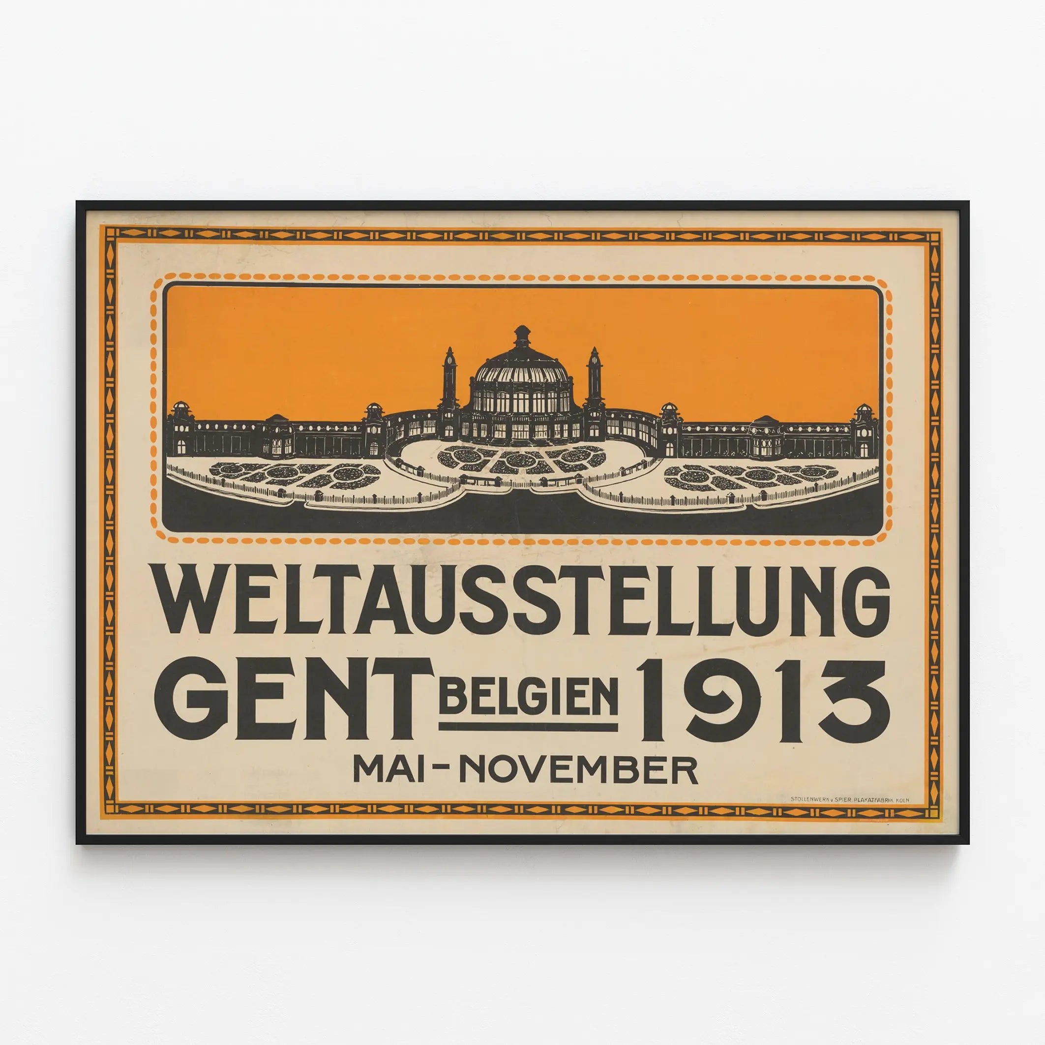 Découvrez cette affiche vintage consacrée à l'Exposition universelle de 1913 qui s'est tenue à Gand, en Belgique. Ce poster historique met en avant l'architecture emblématique du site d'exposition, illustrée en noir et orange avec un style graphique typique du début du XXe siècle. L’affiche est encadrée d’un motif géométrique rappelant l’esthétique Art déco, très prisée lors de cette période. Ce type de décoration murale est parfait pour les amateurs d’art graphique et d’histoire, apportant une touche rétro et culturelle à votre intérieur. Cette affiche murale allie un fort impact visuel grâce à son contraste de couleurs saisissant et sa composition épurée, idéale pour une décoration vintage dans un salon, un bureau ou un espace d'exposition. En intégrant ce poster à votre décoration, vous invitez une pièce de patrimoine historique et artistique, qui célèbre un événement majeur de l'histoire internationale et l'architecture temporaire de l'époque. Ce tableau mural imprimé capture l’esprit d’une grande exposition universelle, synonyme d’innovation et d’échanges culturels. Un choix unique parmi les affiches de décoration murale pour les collectionneurs ou les passionnés d’expositions universelles et d’art graphique ancien. L’affiche sera un élément central pour créer une ambiance authentique et chargée d’histoire dans votre espace. Apportez une touche d’originalité à votre décoration murale avec cette représentation iconique de l’architecture et des événements culturels en Belgique au début du XXe siècle.