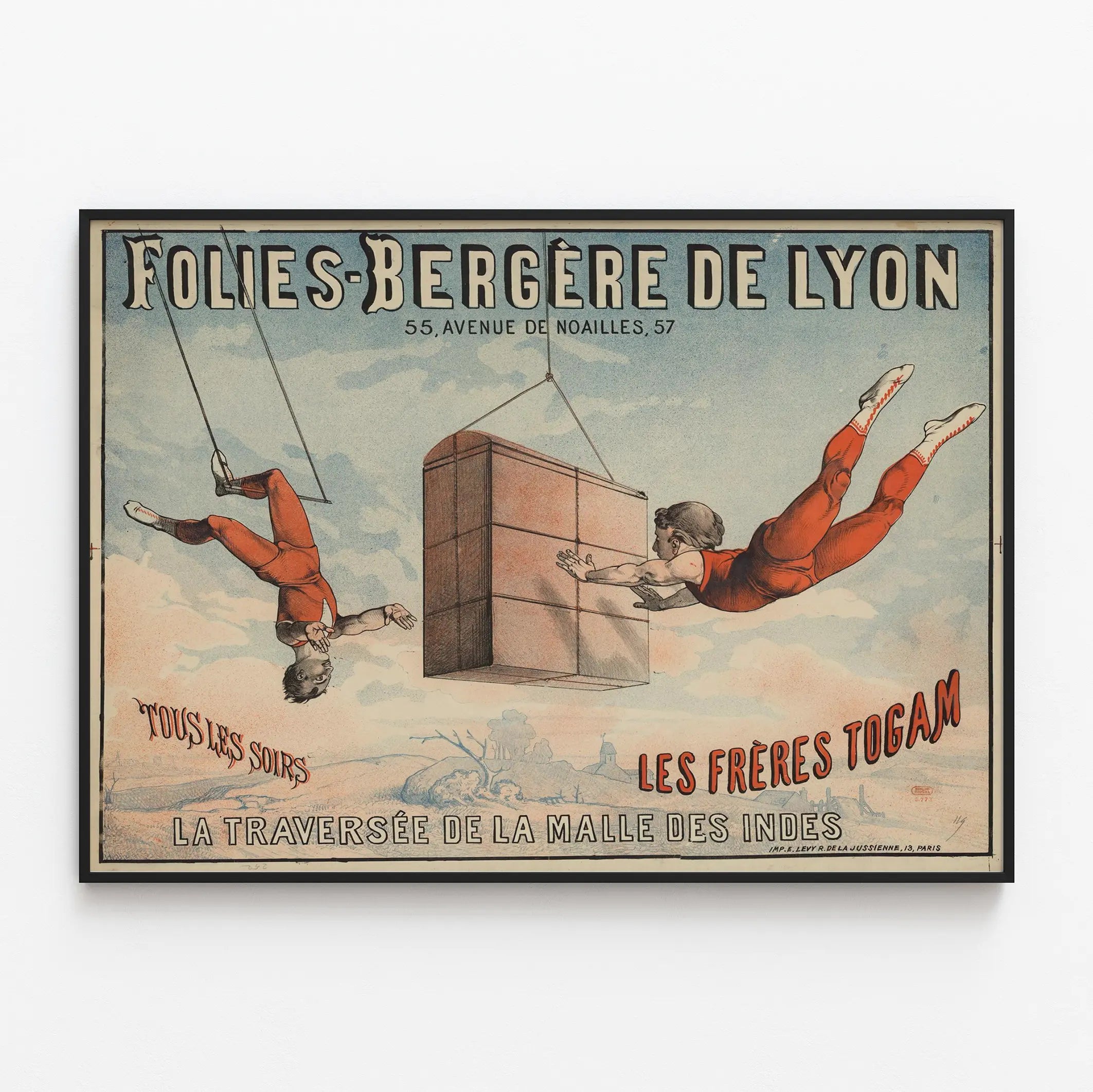 Découvrez cette affiche vintage unique intitulée "Folies-Bergère de Lyon" représentant un spectacle des Frères Togam intitulé "La Traversée de la Malle des Indes". Cette affiche artistique présente deux acrobates en pleine action, évoluant dans un ciel bleu clair parsemé de nuages, suspendus à des cordes. Les artistes portent des tenues rouges vives, accentuant leur mouvement et leur agilité. Ce poster ancien mêle un style graphique remarquable à une mise en scène captivante, évoquant l'univers du cirque et des spectacles de variété. Cette décoration murale est idéale pour les amateurs d'affiches vintage, les passionnés de spectacles et d'acrobaties ou toute personne souhaitant ajouter une touche d'histoire et d'énergie à son intérieur. Ce tableau décoratif met en valeur le charme intemporel des arts du spectacle et s'adapte parfaitement aux styles de décoration classiques ou éclectiques. L'affiche comprend un texte en français indiquant l'adresse "55, avenue de Noailles, 57" ainsi que les mentions "Tous les soirs" et le nom des artistes "Les Frères Togam", renforçant l'authenticité et l'esprit de ce visuel d'époque. La composition met également en scène une grande malle suspendue, ajoutant une dimension narrative à cette œuvre de décoration murale. Ce poster sera une pièce maîtresse dans une galerie murale ou un espace dédié à l'art et la culture, particulièrement dans un salon, une salle de spectacle ou un bureau. En affichage encadré ou en poster libre, il apporte une ambiance dynamique et ludique à votre décoration d'intérieur. Choisissez cette affiche vintage Folies-Bergère de Lyon pour une décoration murale pleine de caractère, célébrant la performance et la créativité des Frères Togam dans un style graphique et historique impressionnant.