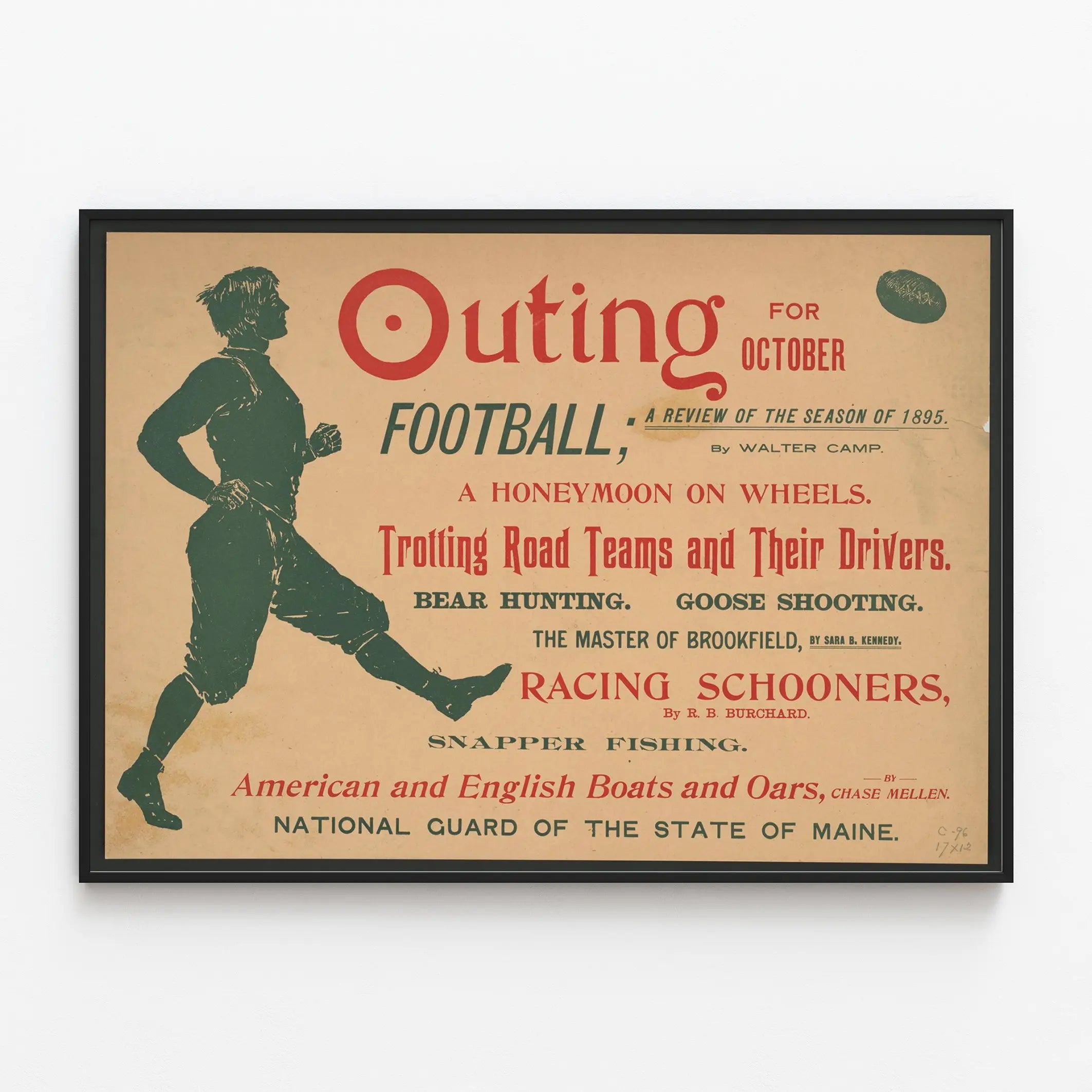 Cette affiche vintage représente une décoration murale idéale pour les passionnés d'histoire sportive et des activités de plein air du XIXe siècle. Intitulée "Outing for October", elle met en avant une revue de la saison 1895, abordant divers thèmes comme le football, les courses de trotteurs et leurs conducteurs, la chasse à l'ours et à l'oie, la pêche au vivaneau, ainsi que les courses de goélettes. Avec son style typographique rétro en rouge et vert, cette affiche capture l'essence des loisirs d'automne et des activités nautiques américaines et anglaises de l'époque. L'image intègre aussi un joueur de football stylisé, ajoutant un élément visuel dynamique qui complète le texte. Cette décoration murale, composée d'un papier à coloris beige légèrement vieilli, est parfaite pour une mise en scène vintage dans un intérieur ou une collection dédiée aux affiches sportives et historiques. Que ce soit pour un salon, un bureau ou une salle de jeux, ce poster apportera une touche d'authenticité et de nostalgie, reflétant l'engouement des années 1890 pour les sports et les sorties en plein air.