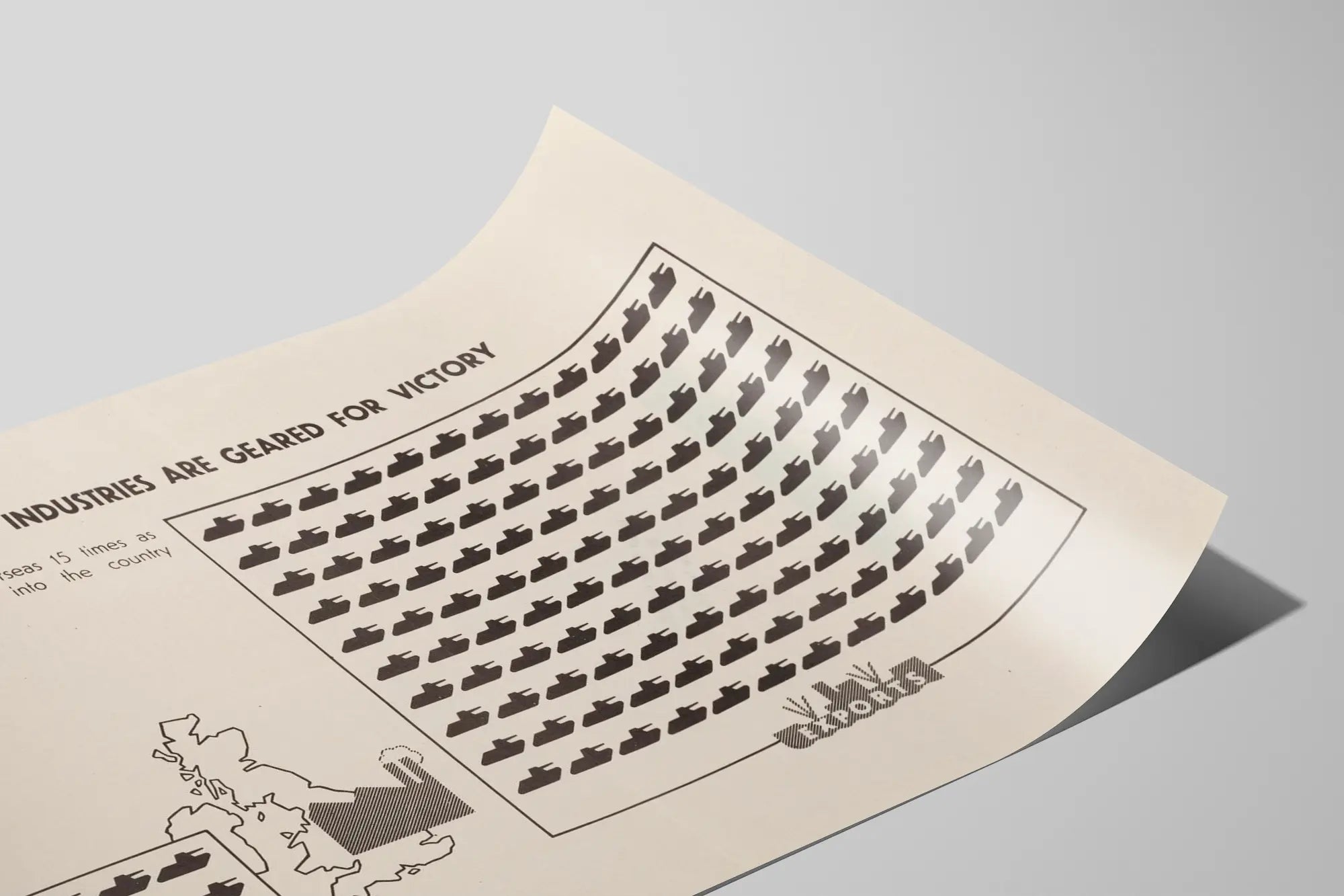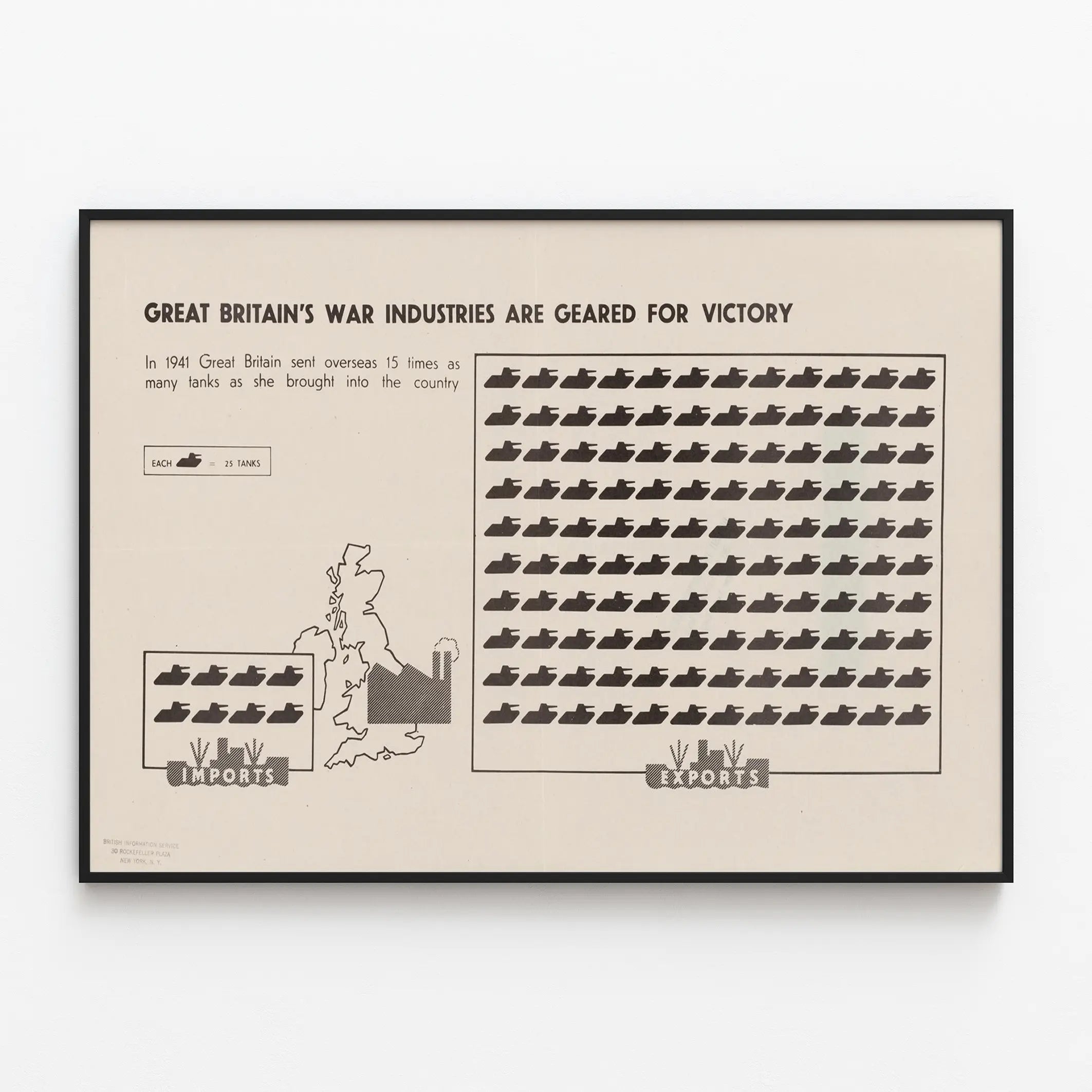 Cette affiche vintage met en avant la puissance de l'industrie de guerre britannique en 1941, avec un graphique illustrant la production et l'exportation de chars d'assaut. Sur un fond clair, deux encadrés représentent visuellement le nombre de chars importés et exportés par la Grande-Bretagne. Chaque icône en forme de char symbolise 25 chars, permettant de visualiser facilement la quantité impressionnante d'équipements militaires produits par le pays à cette période. Le texte en haut indique que la Grande-Bretagne a envoyé à l'étranger quinze fois plus de chars qu'elle n'en a importé, soulignant sa capacité industrielle tournée vers la victoire. Cette affiche, imprimée en noir et blanc, joue sur un aspect minimaliste et informatif qui conviendra parfaitement comme élément de décoration murale dans un intérieur au style industriel ou rétro. Elle est idéale pour les passionnés d'histoire militaire ou pour ceux qui aiment intégrer des pièces graphiques et éducatives à leur décoration. Ce poster allie esthétique vintage et information visuelle claire, créant un tableau original révélant un moment clé de l'histoire industrielle et militaire. Parfaite pour un bureau, une bibliothèque ou un salon, cette affiche donnera du caractère et une touche d'authenticité à n'importe quel mur, tout en racontant une histoire forte au travers d'un graphique simple mais évocateur.
